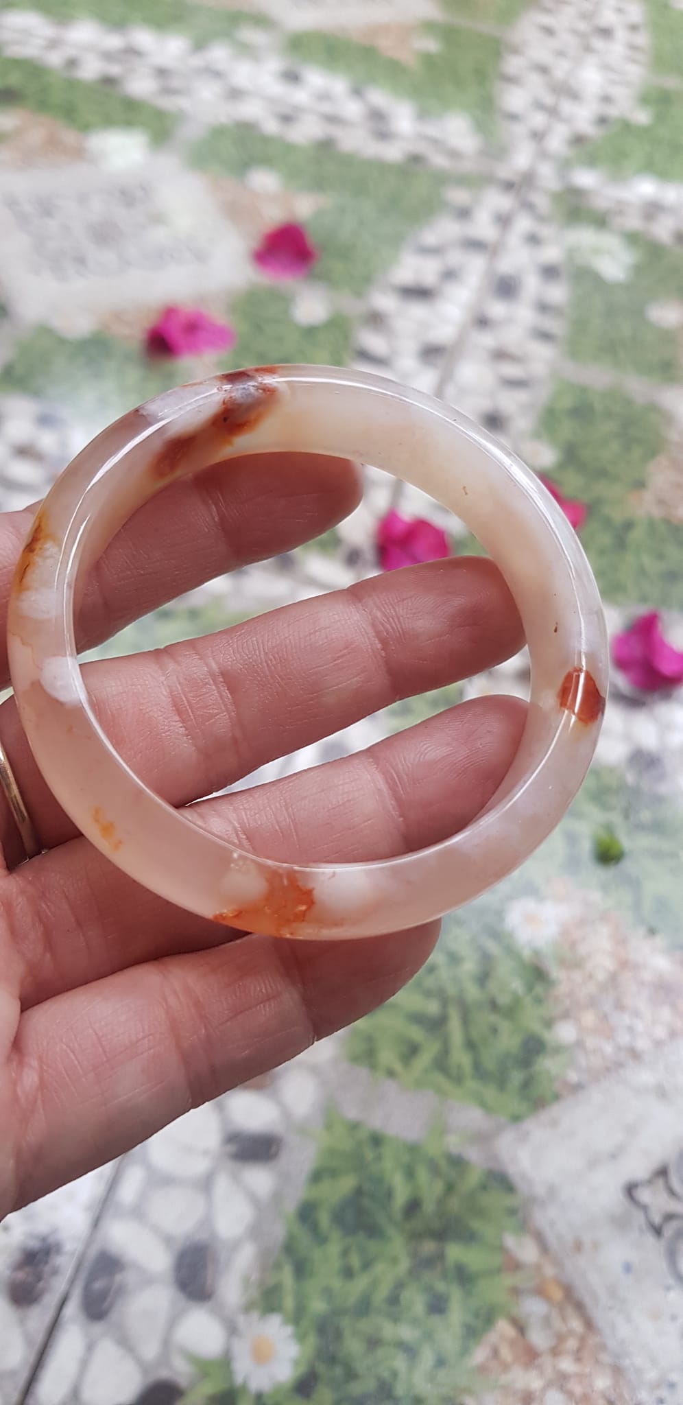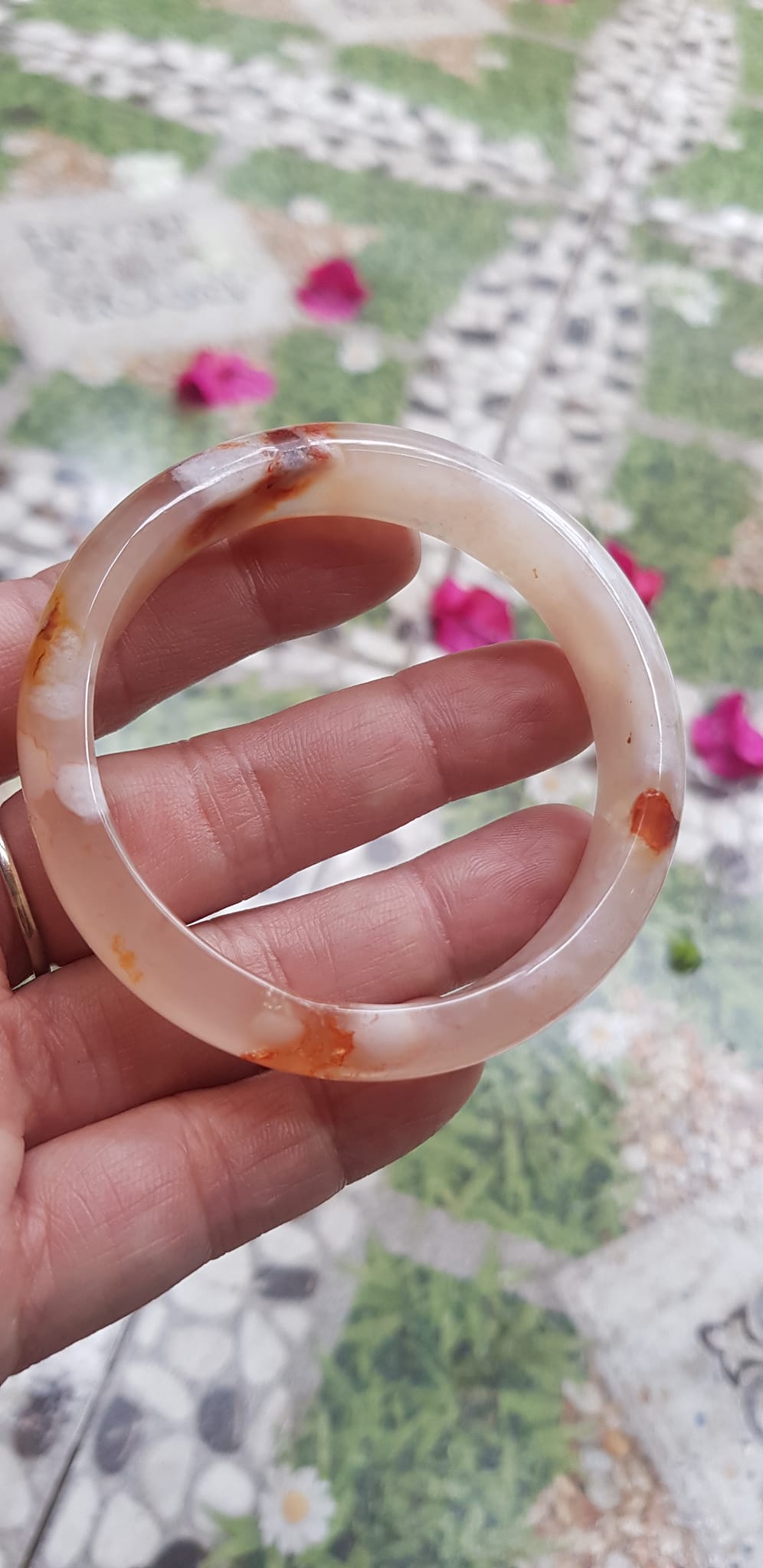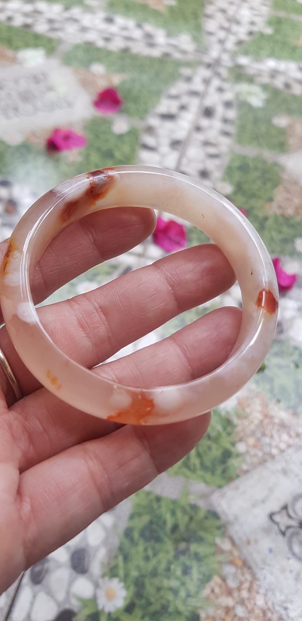 Vòng tay Nữ Bản Hẹ Mới Đá Mã Não Bông Tuyết Hồng nhẹ trắng trong bóng quá đẹp luôn ạ Ni 53mm x Cao 11mm x dầy 7mm Nữ Cân nặng 52kg - 55kg đeo