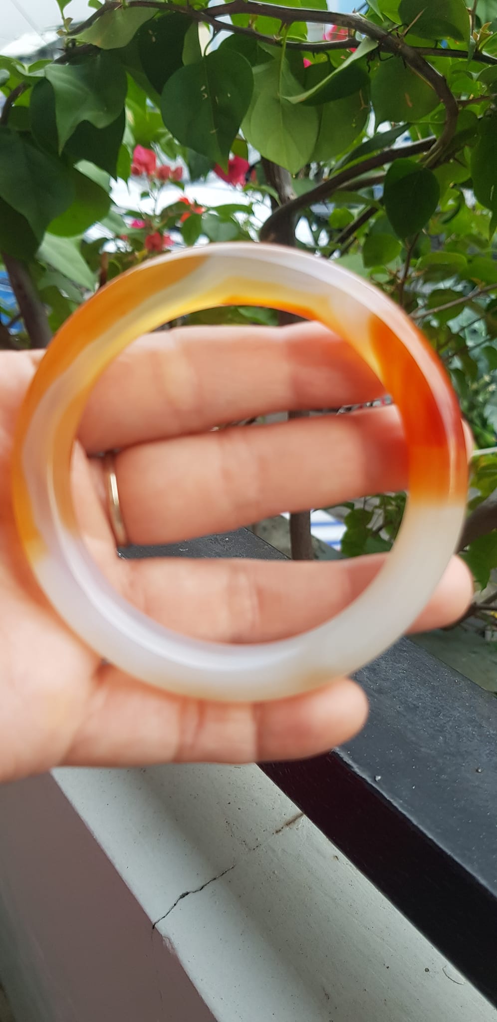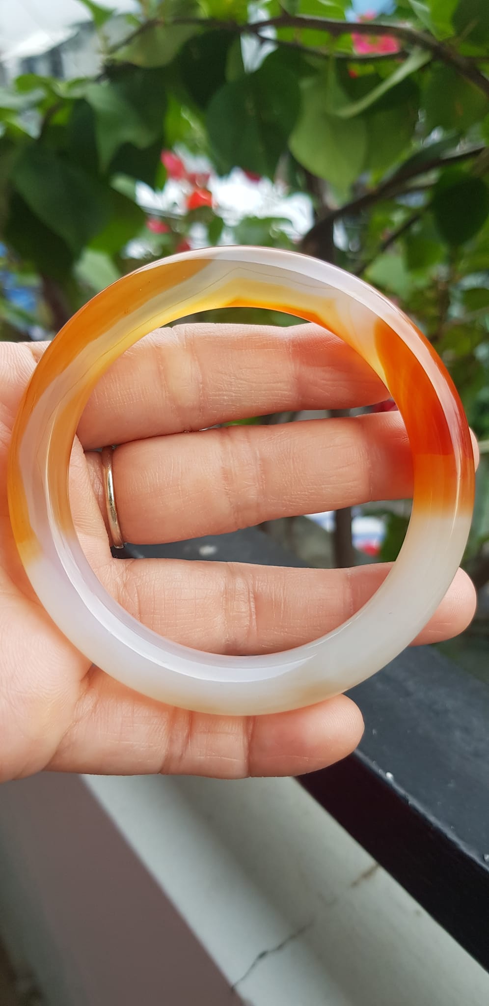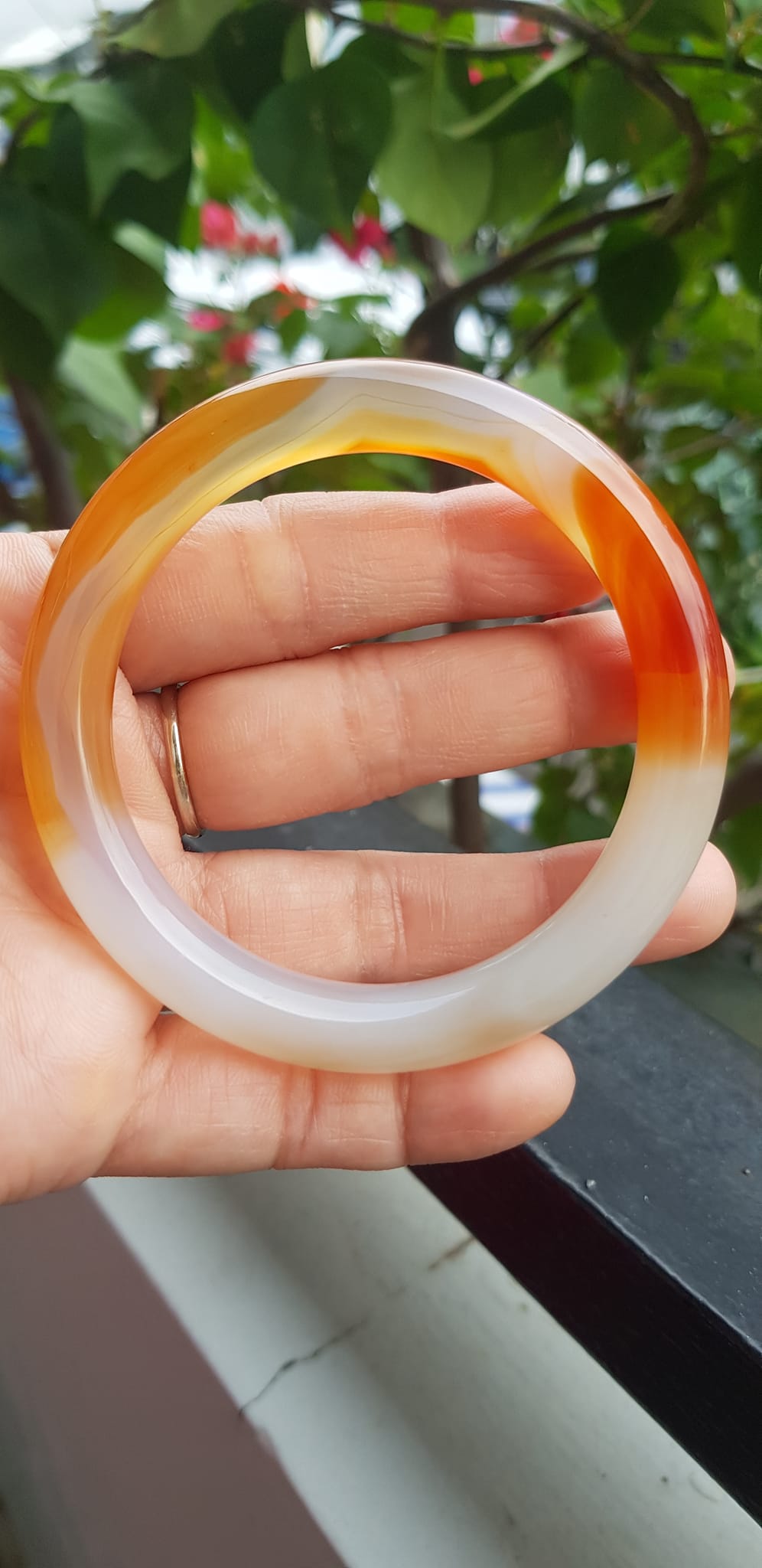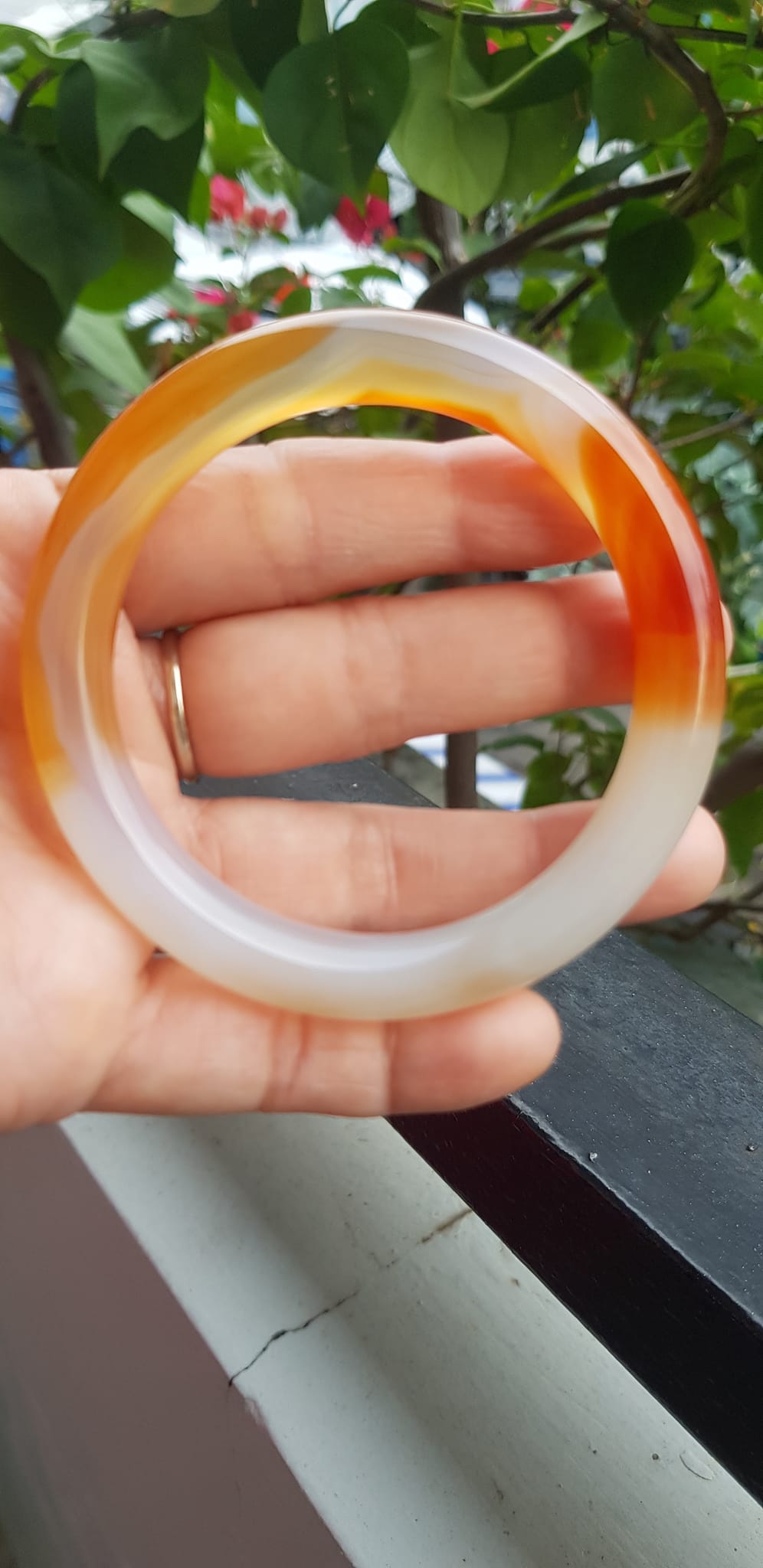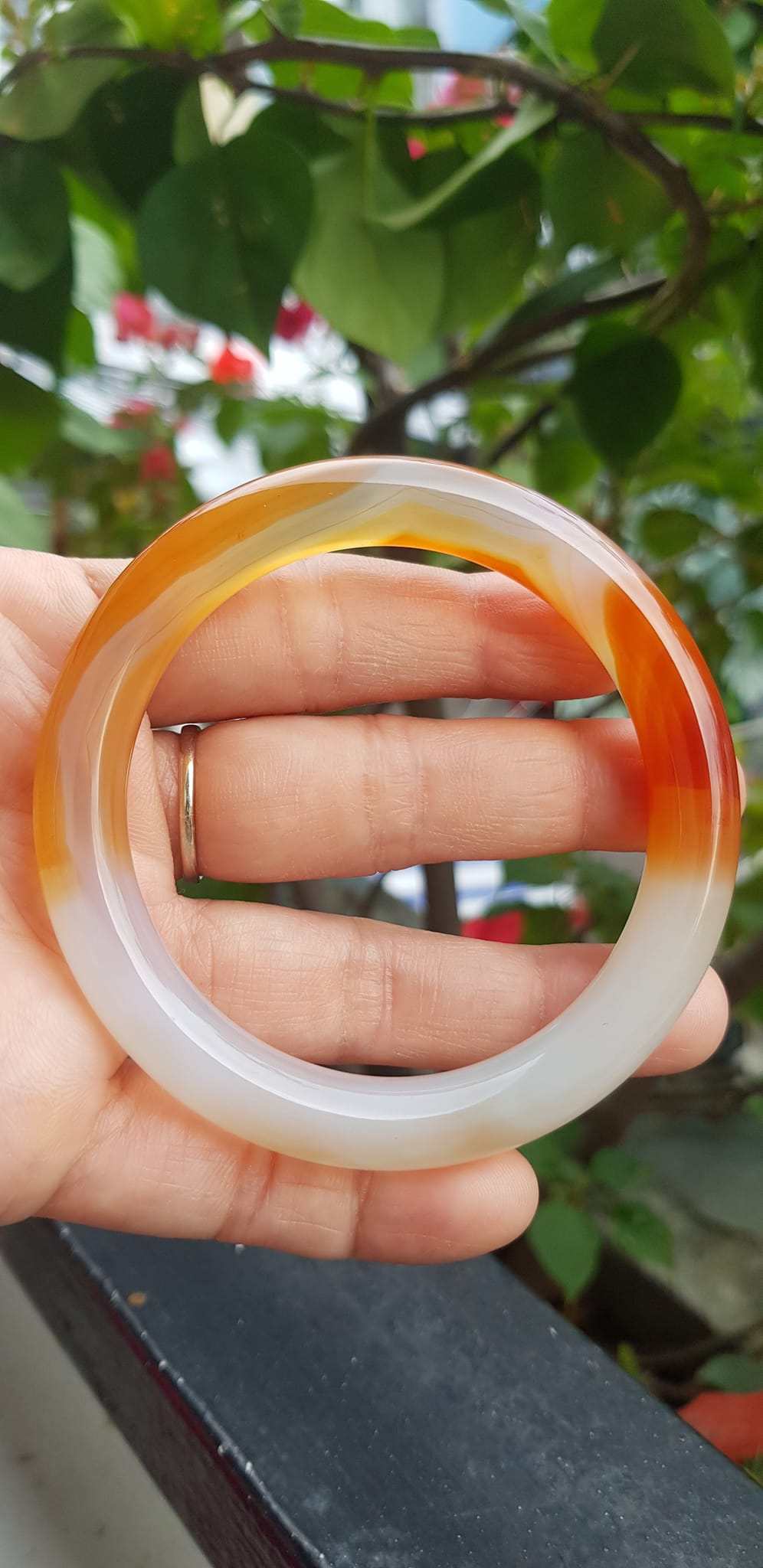 ✨Vòng tay Nữ đá mã não đỏ cam trắng Ni 56mm x chột to 9mm Màu trắng đỏ cam nhẹ 1 bên vân nhẹ nhàng đẹp ạ Nữ 55kg - 63kg đeo xinh tay đẹp ạ