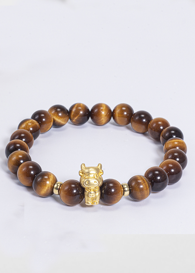 Vòng Tay Phong Thủy Đá Mắt Hổ Vàng Nâu Phối Charm Tuổi Sửu Bạc Mạ Vàng 24K (8mm) Mệnh Thổ, Kim