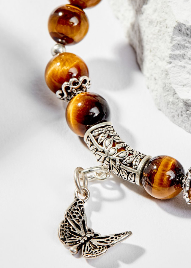 Từ lâu người ta đã biết đá mắt hổ vàng nâu như một viên đá vô cùng tuyệt với tần số rung động cao giúp thu hút những điều tốt đẹp và may mắn trong cuộc sống. Giúp loại bỏ lo âu, căng thẳng, giúp tinh thần luôn tỉnh táo, lạc quan. Vòng Tay Phong Thủy Nữ Đá Mắt Hổ Vàng Nâu Phối Charm Bướm Bạc (8mm) Mệnh Thổ, Kim được làm từ đá mắt hổ vàng nâu.