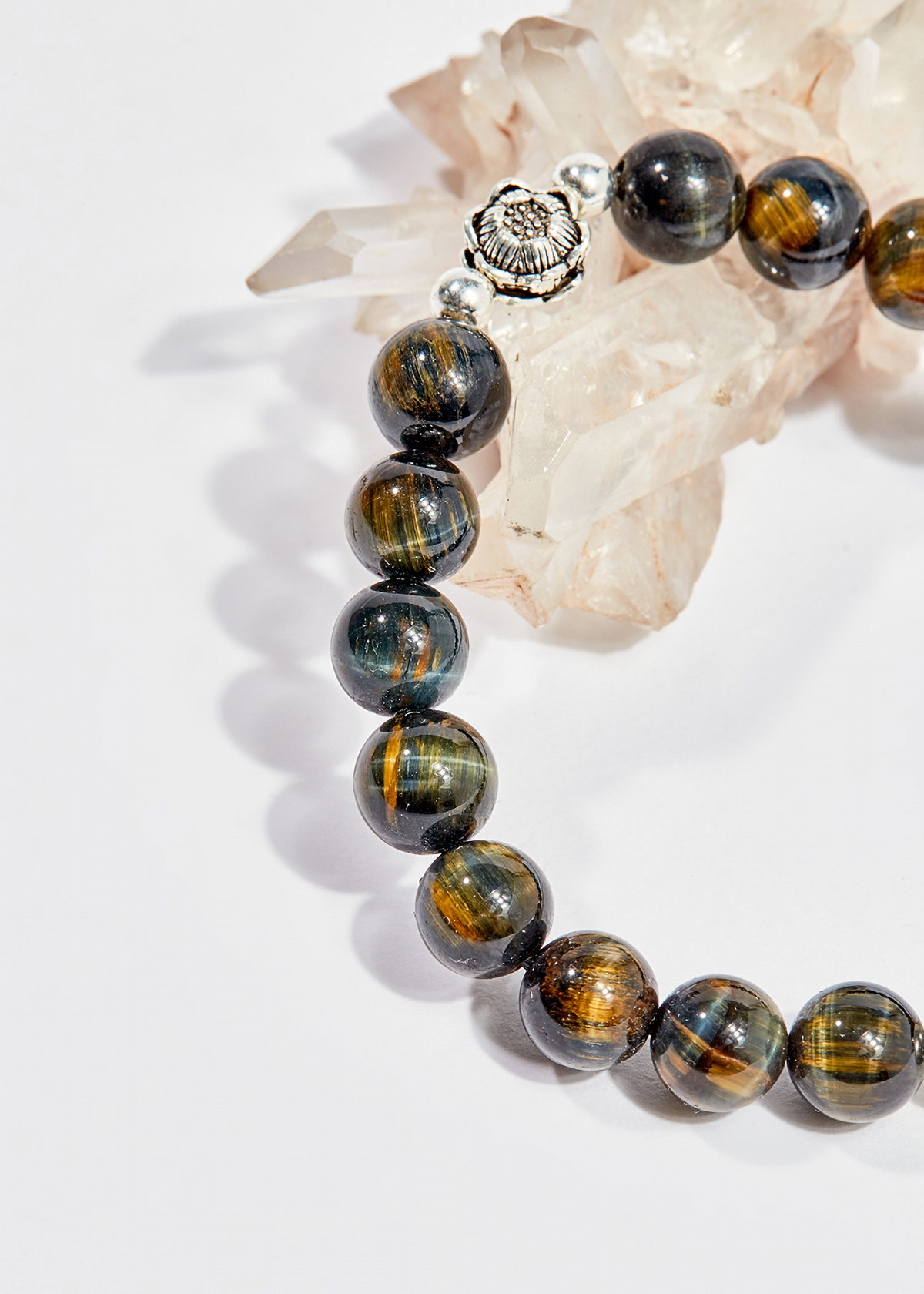 VÒNG TAY ĐÁ MẮT HỔ XANH ĐEN PHỐI CHARM: Đá Mắt Hổ có tên khoa học là Tiger Eye, là một loại tinh thể biến chất có màu sắc từ vàng, nâu đỏ đến xanh