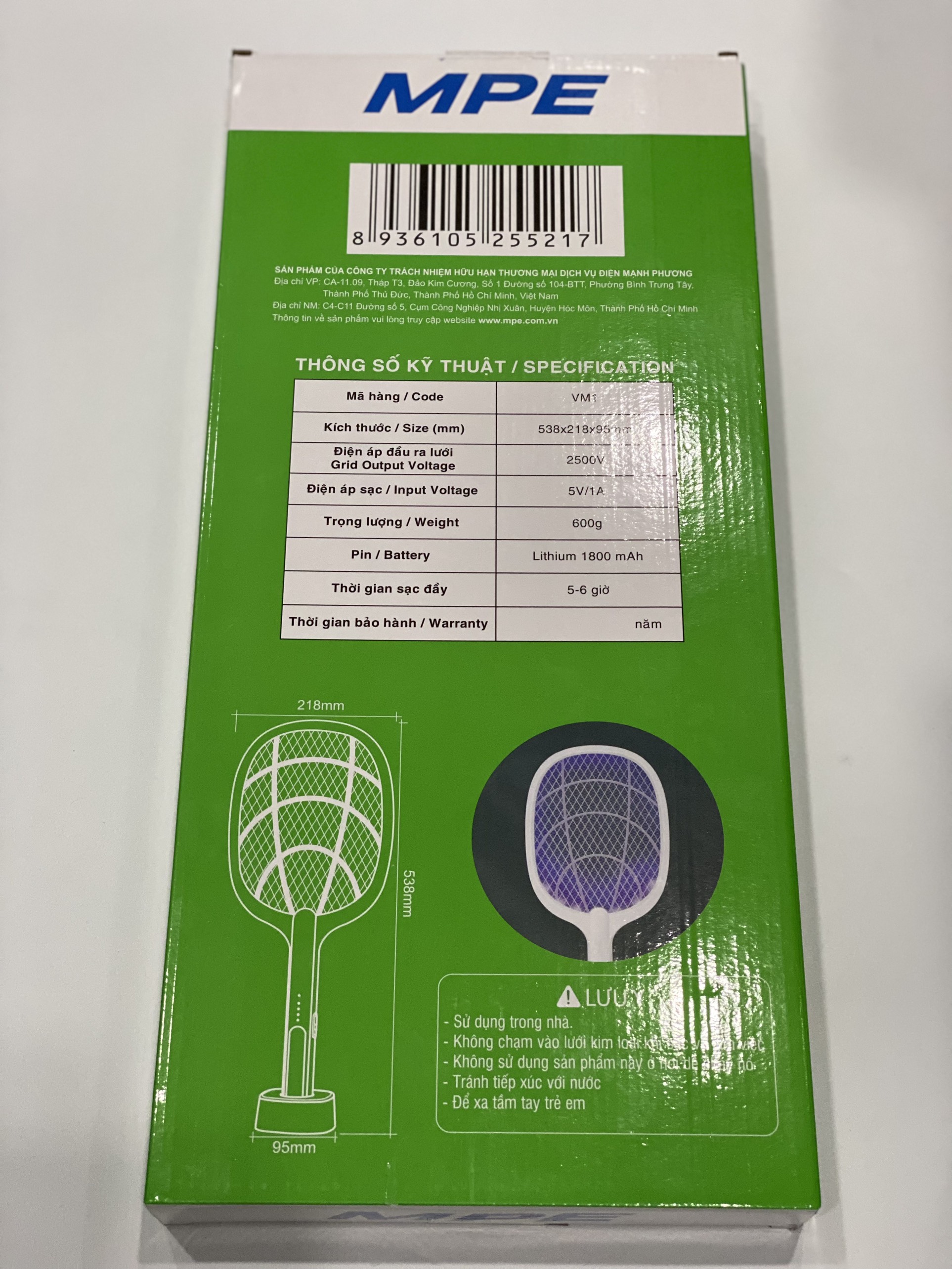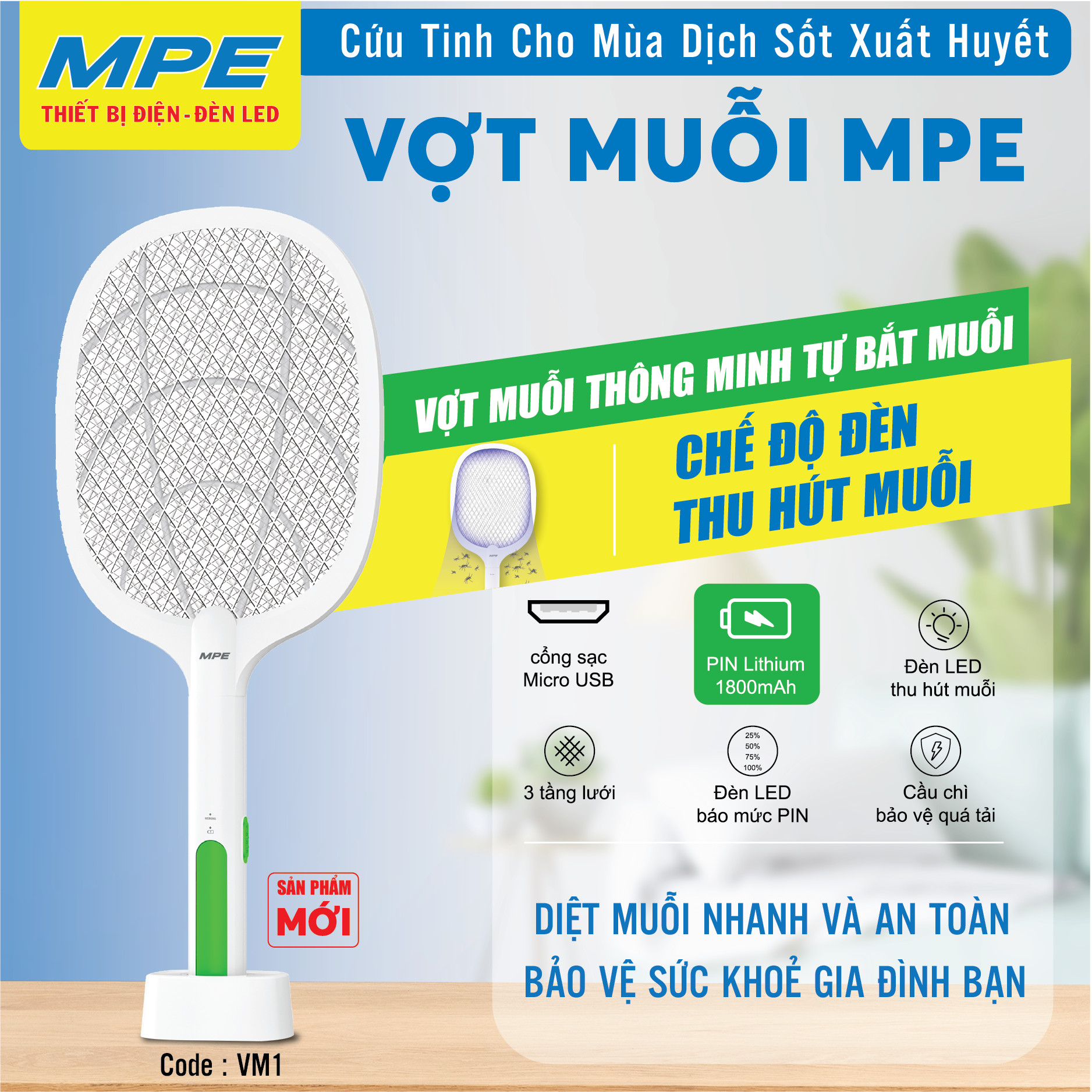 - Sản phẩm có bảo vệ quá tải và bảo vệ ngắn mạch tải, át hiện chính xác điện áp sạc để đảm bảo an toàn khi sạc. Ưu điểm của vợt muỗi MPE - VM1: Tự động khử điện dư khi dừng hoạt động bắt muỗi Trang bị 6 đèn thu hút muỗi với ánh sáng tím Có chế độ tự động tắt nguồn khi sạc đầy Trang bị cầu chì vào thiết bị (bảo vệ quá tải và ngắt mạch tải) đảm bảo an toàn khi sạc .
