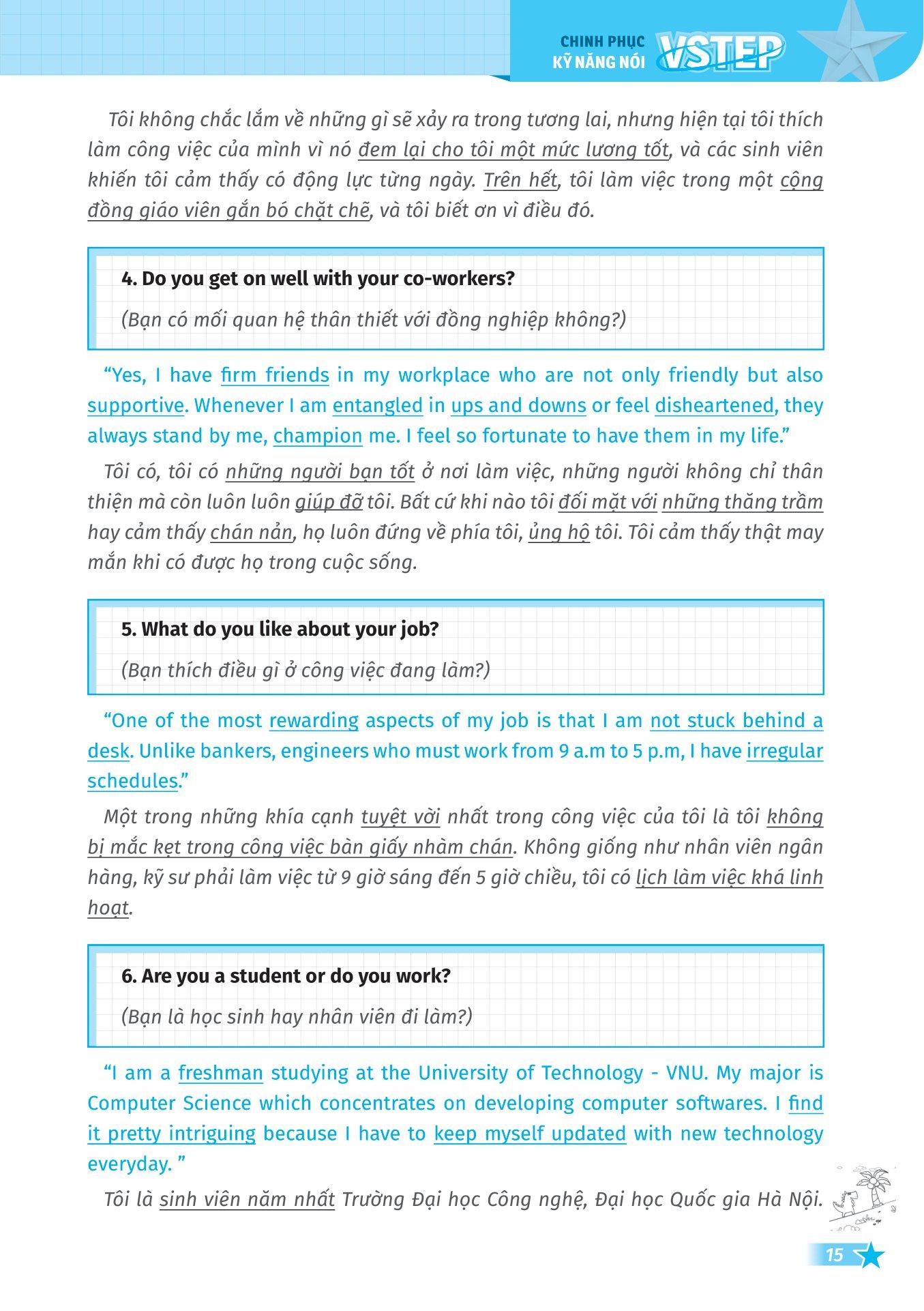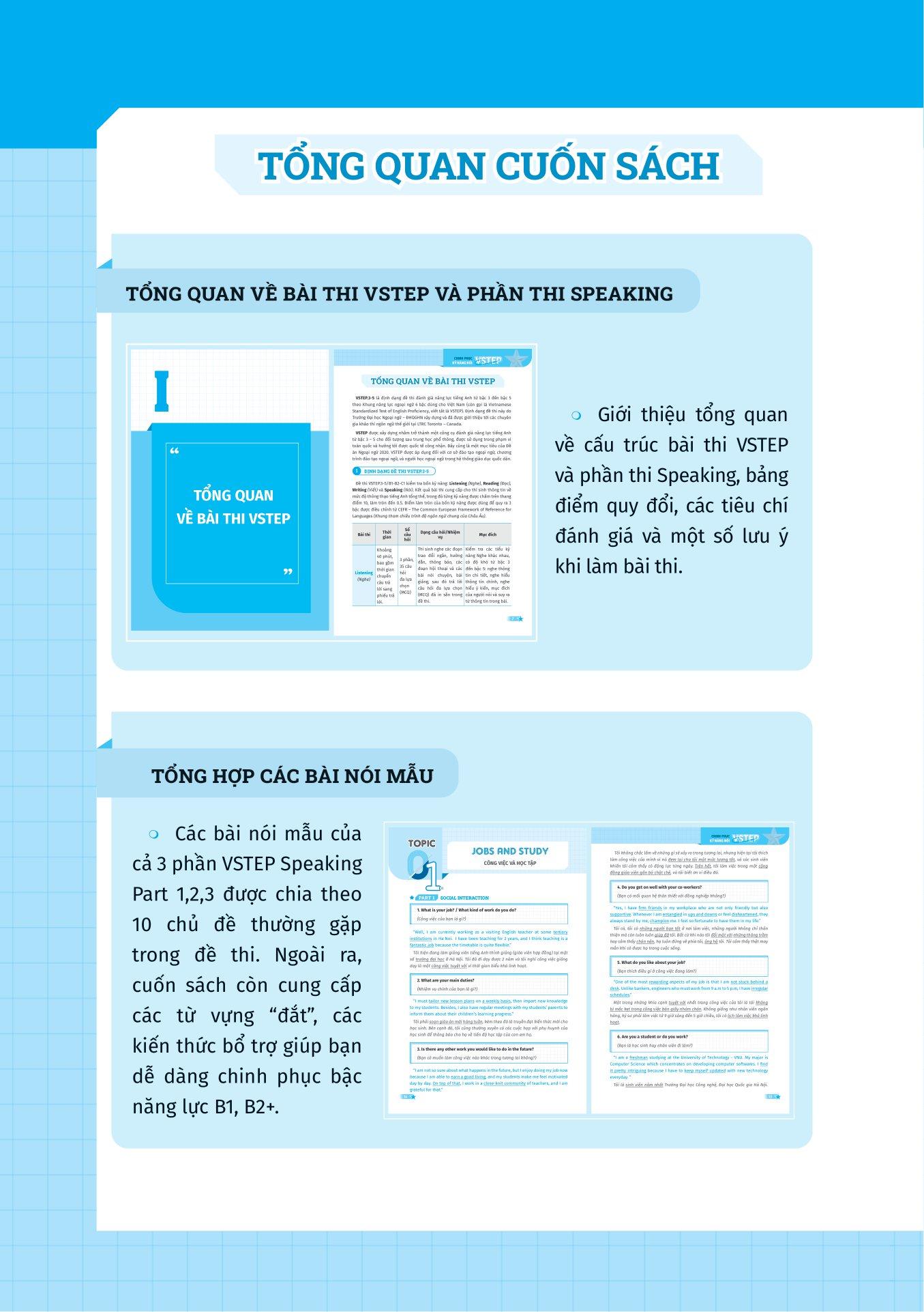 VSTEP - Chinh Phục Kỹ Năng Nói Bậc B1, B2+ Cuốn sách được chia thành 10 bài học, mỗi bài học tập trung vào 1 chủ đề người học thường gặp trong kì thi VSTEP.