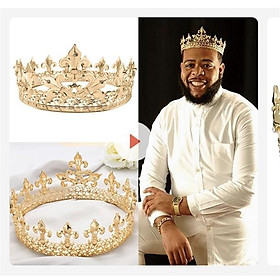 ✨Vương miện nam vương tròn màu vàng Hoa văn đính đá cao 8 cm