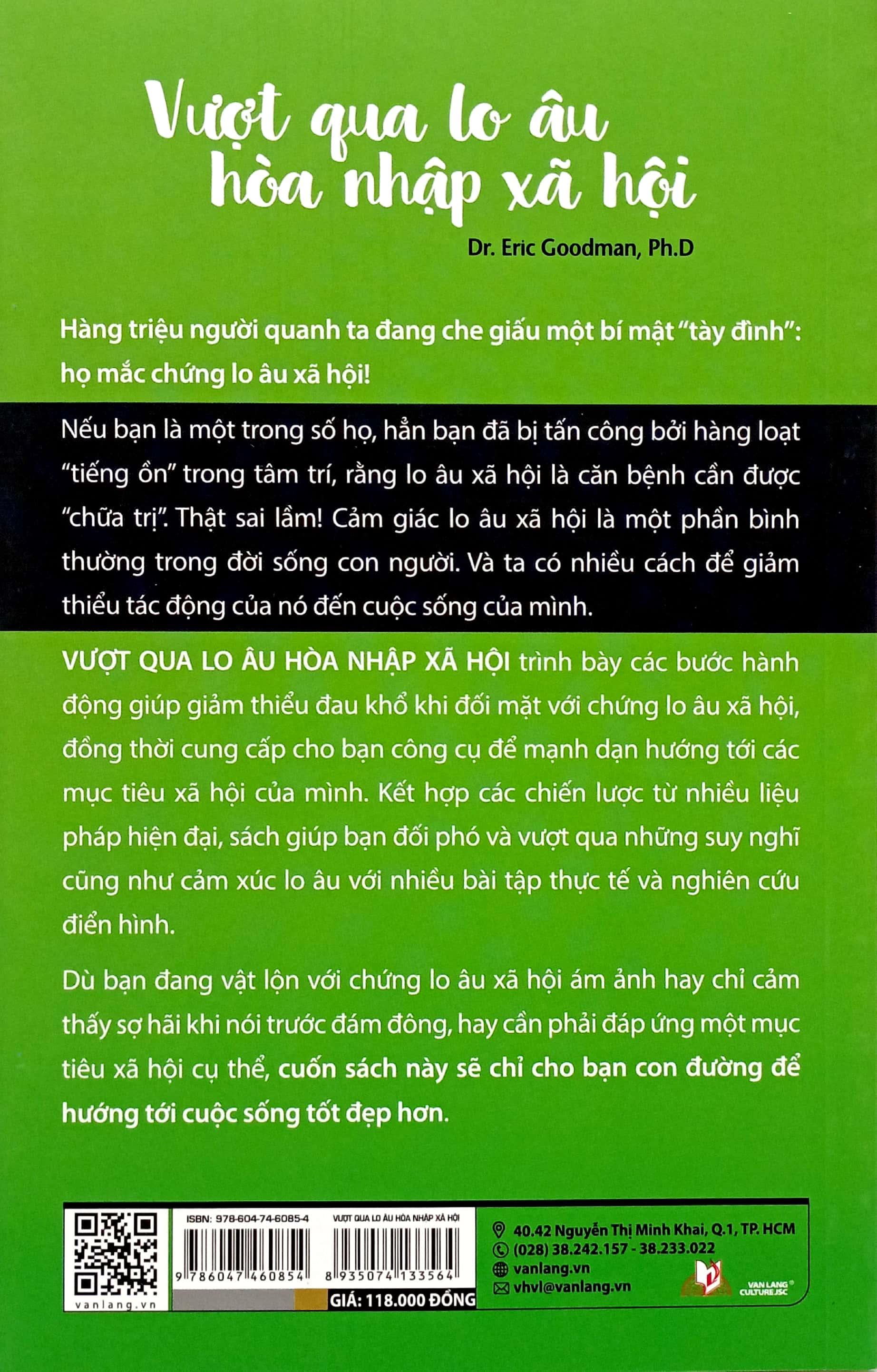 Vượt Qua Lo Âu Hòa Nhập Xã Hội trình bày các bước hành động giúp giảm thiểu đau khổ khi đối mặt với chứng lo âu xã hội, đồng thời cung cấp cho bạn công cụ để mạnh dạn hướng tới các mục tiêu xã hội của m.ình. Kết hợp các chiến lược từ nhiều liệu pháp hiện đại, sách giúp bạn đối phó và vượt qua những suy nghĩ cũng như cảm xúc lo âu với nhiều bài tập thực tế và nghiên cứu điển hình.