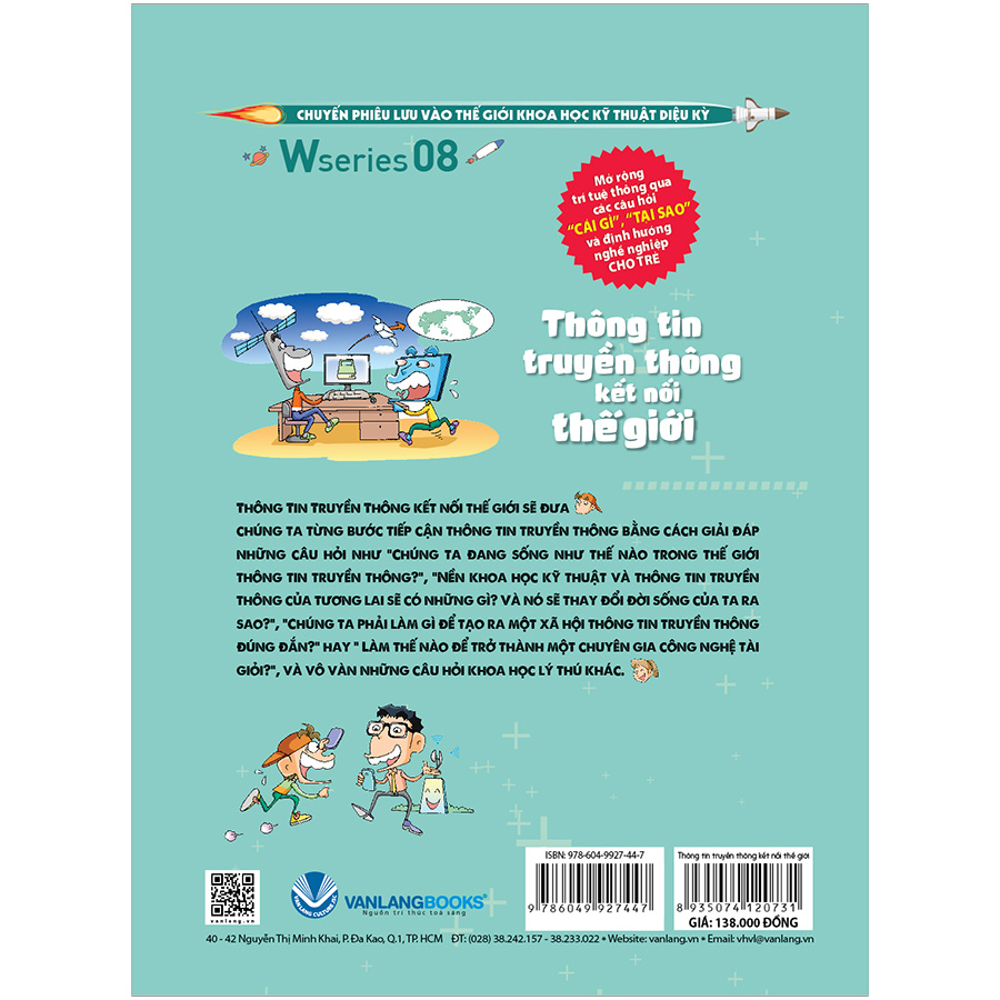 Mua tại TiktokLần này, các nhân vật quen thuộc trong W-series sẽ du hành vào vùng đất của công nghệ thông tin và truyền thông. Theo chân những trang sách, các bạn đọc trẻ tuổi sẽ có cơ hội được làm quen và chứng kiến những thành tựu công nghệ đã giúp ích cho việc liên lạc, giao tiếp của con người, bắt đầu từ những phương pháp thô sư như truyền tin bằng diều, khói, chim bồ câu, hay cấp báo bằng ngựa, cho đến điện thoại di động và Internet như ngày nay. Hứa hẹn rằng cuộc phiêu lưu lần này sẽ khiến bạn đọc há hốc trước những thông tin đáng kinh ngạc về cách con người chinh phục được khoảng cách địa lý và thời gian bằng công nghệ thông tin truyền thông .