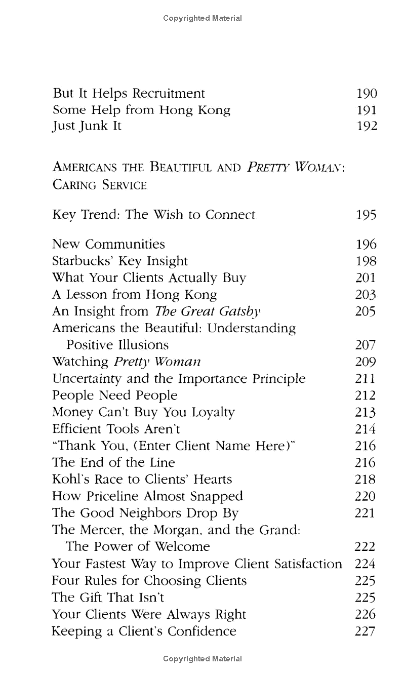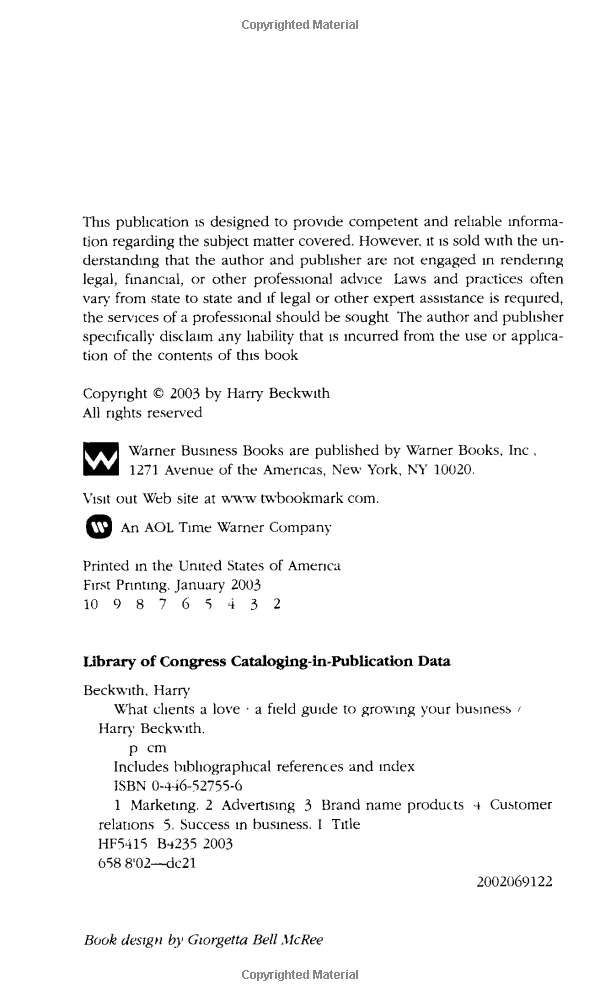 In WHAT CLIENTS LOVE, Harry Beckwith discusses effective business tactics with the practical, down-to-earth style that has made him a best-selling author and trusted marketing expert. He explains the sheer simplicity of a marketing plan - how to find your company's position, how to define a brand and how to manage that brand so it has its full and overwhelming impact. With sections such as 'Thinking and Planning', 'Communicating' and 'Serving The Client', Beckwith shows how effective marketeers need to be brief, succinct and 'cut to the close'. WHAT CLIENTS LOVE also reveals the very nature of a service and why the phrase 'pushing the product' itself begins to suggest why this more aggressive approach fails, since you cannot 'push' a relationship, as people know from their failed attempts to do so in non-business situations.