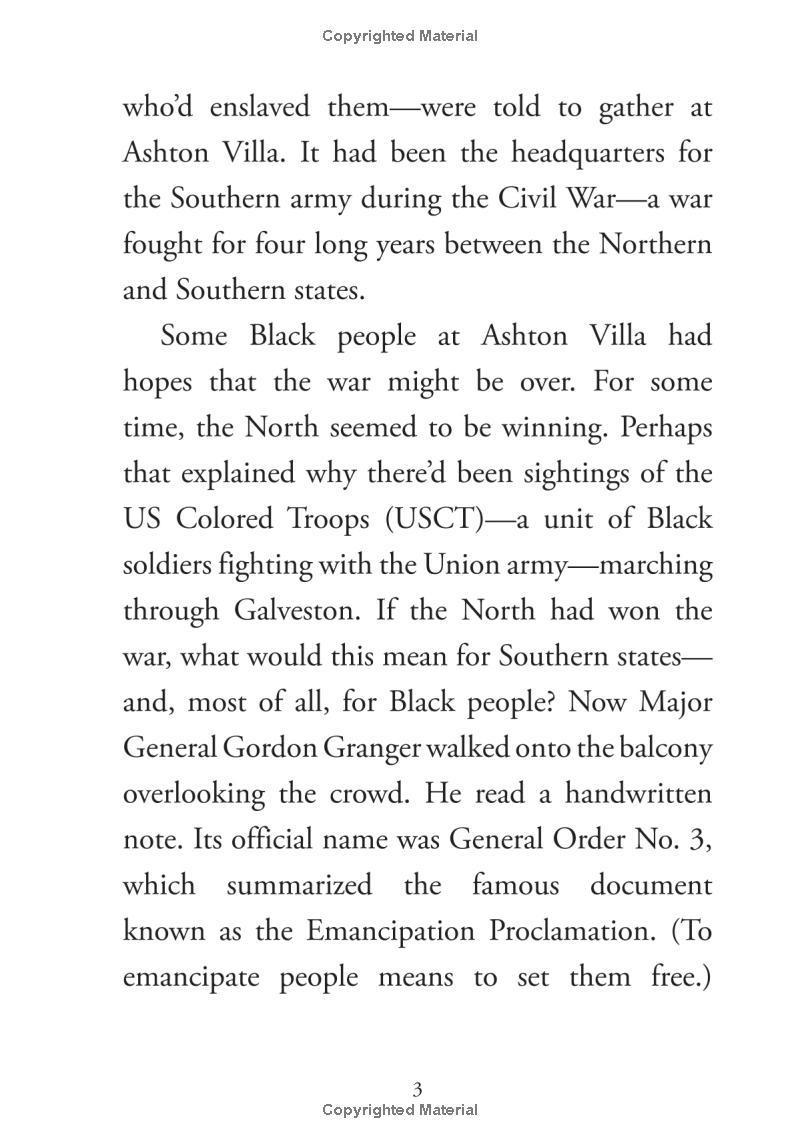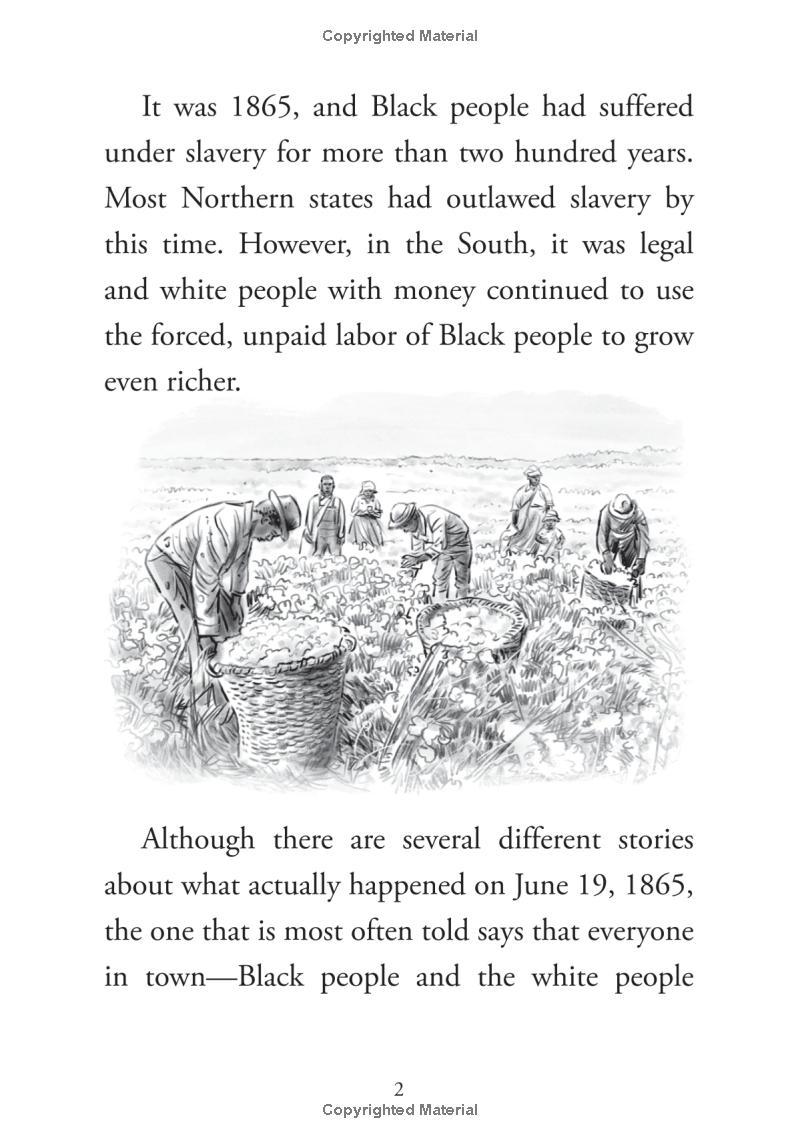 On June 19, 1865, a group of enslaved men, women, and children in Texas gathered around a Union solder and listened as he read the most remarkable words they would ever hear. They were no longer enslaved: they were free. The inhumane practice of forced labor with no pay was now illegal in all of the United States. This news was cause for celebration, so the group of people jumped in excitement, danced, and wept tears of joy. They did not know it at the time, but their joyous celebration of freedom would become a holiday--Juneteenth--that is observed each year by more and more Americans.
