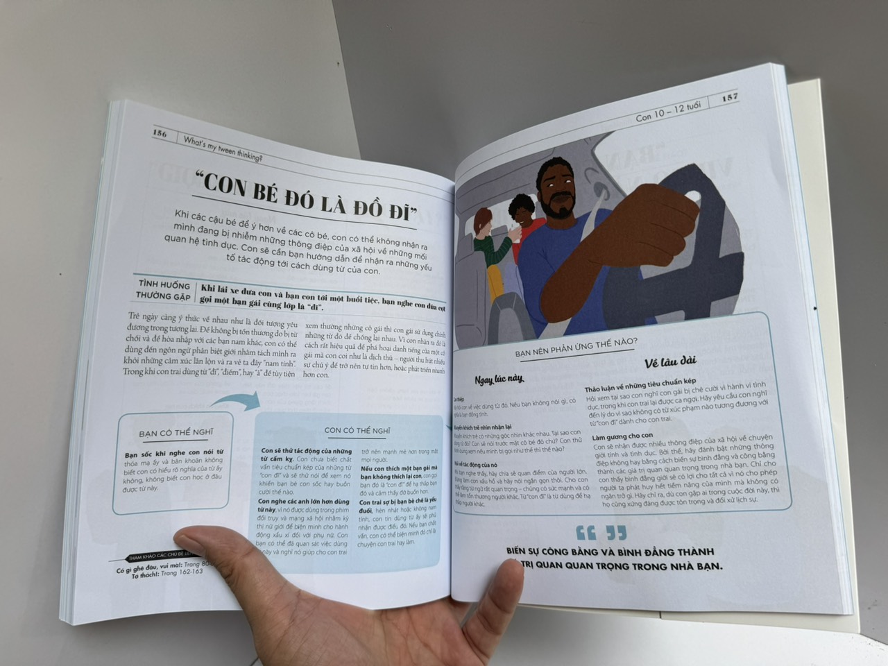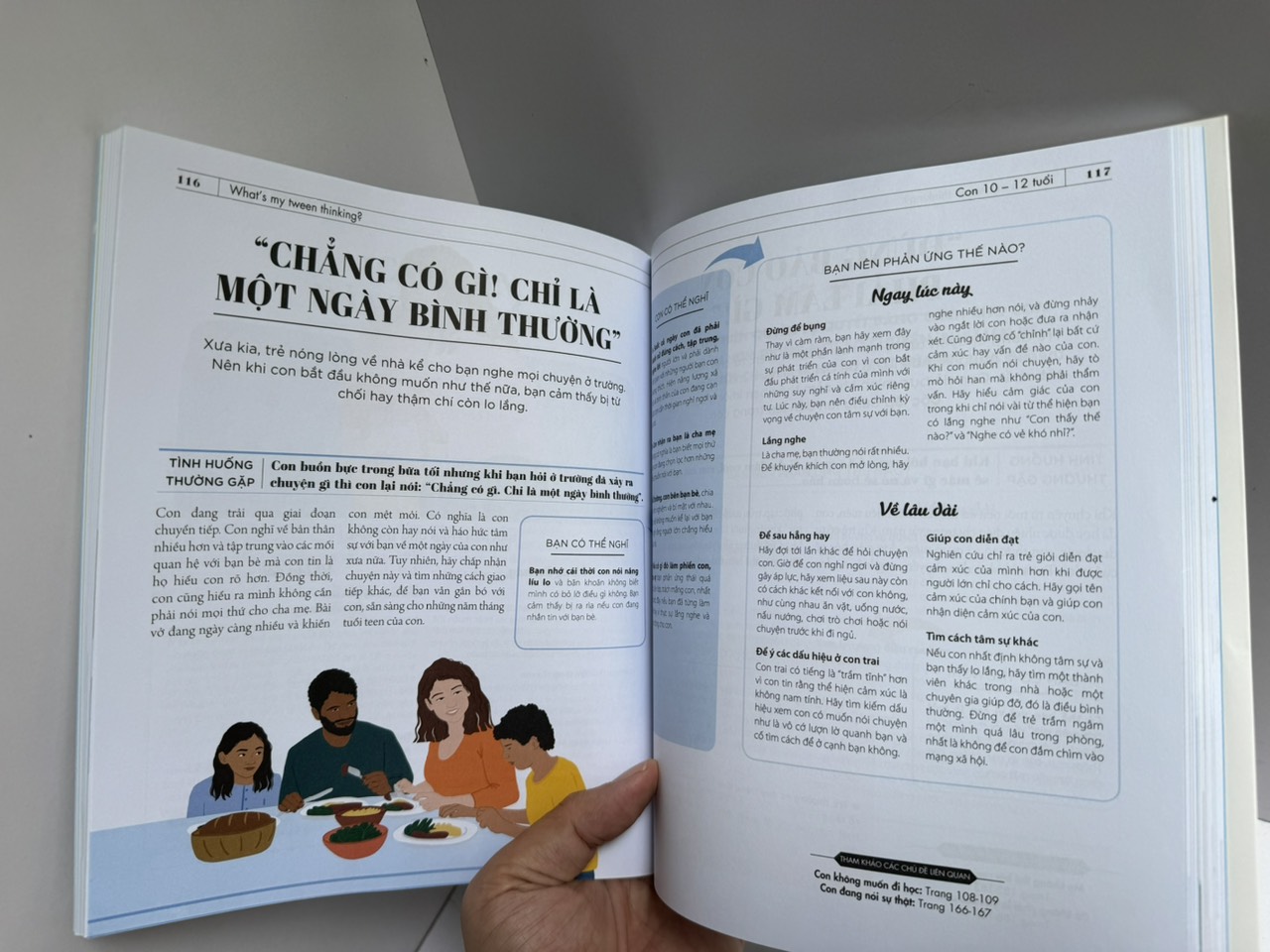 Cuốn sách nằm trong bộ ba sách tâm lý học ứng dụng dành cho cha mẹ do DK phát hành và Thái Hà Books nắm bản quyền tiếng Việt. Đây là một tài liệu tham khảo chi tiết và rõ ràng cho những bậc cha mẹ đang có con trong độ tuổi từ 8 đến 12. Với minh họa màu và cách trình bày khoa học, bạn đọc sẽ thấy thật dễ để nắm bắt những điều mình cần. Sau mỗi cuốn sách là bảng tra cứu, tiện lợi cho cha mẹ khi muốn tìm hiểu về một vấn đề gắn với tình huống cụ thể của con mình.