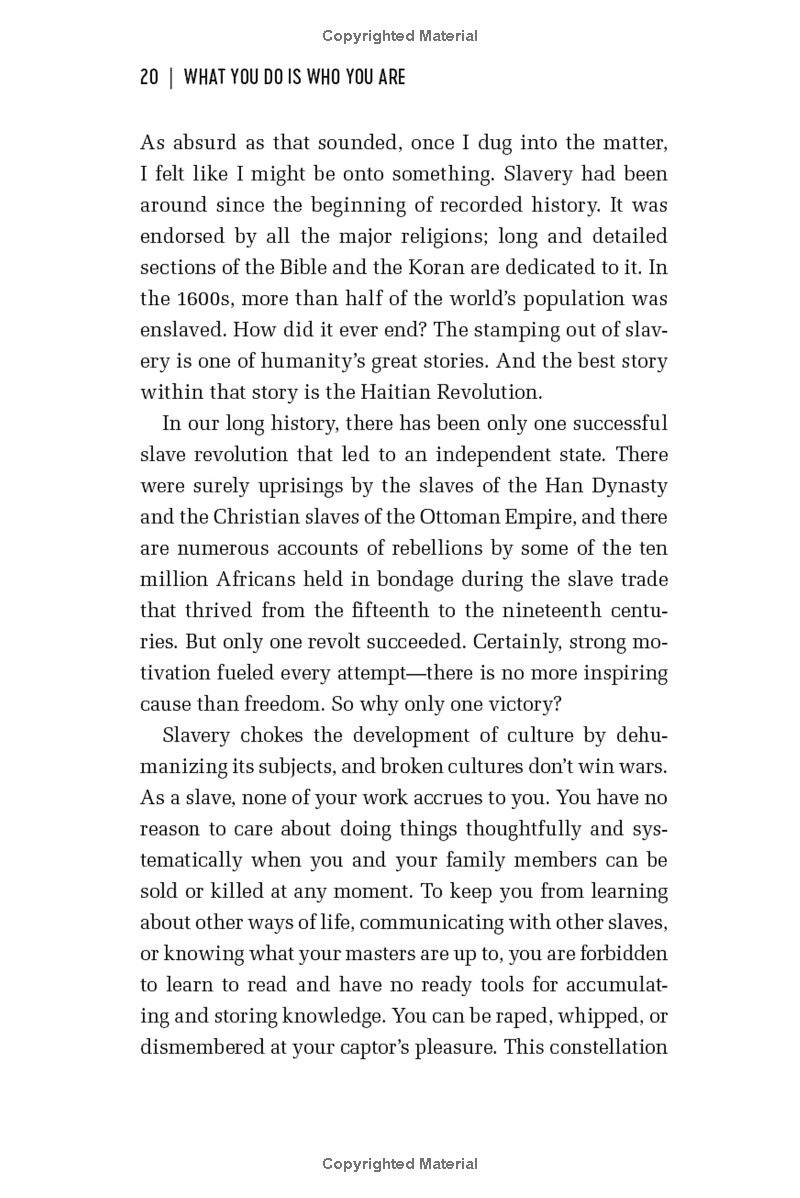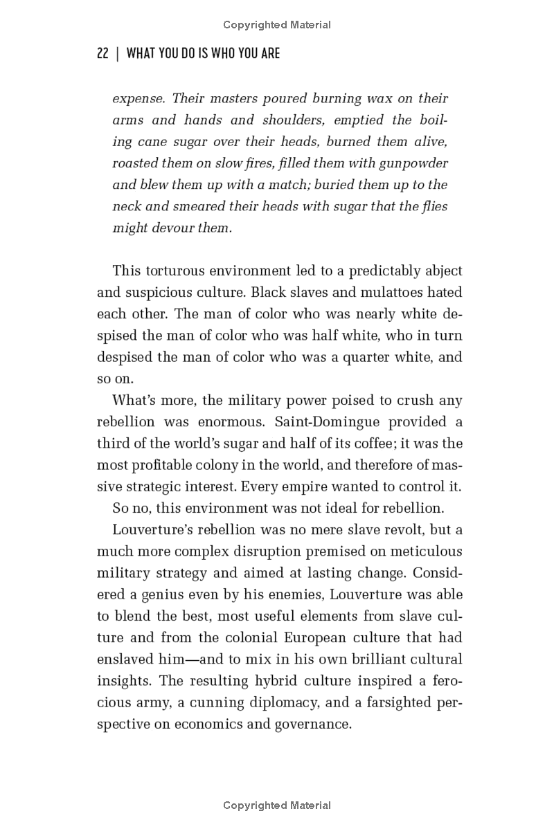 What You Do Is Who You Are explains how to make your culture purposeful by spotlighting four models of leadership and culture-building--the leader of the only successful slave revolt, Haiti's Toussaint Louverture; the Samurai, who ruled Japan for seven hundred years and shaped modern Japanese culture; Genghis Khan, who built the world's largest empire; and Shaka Senghor, a man convicted of murder who ran the most formidable prison gang in the yard and ultimately transformed prison culture.