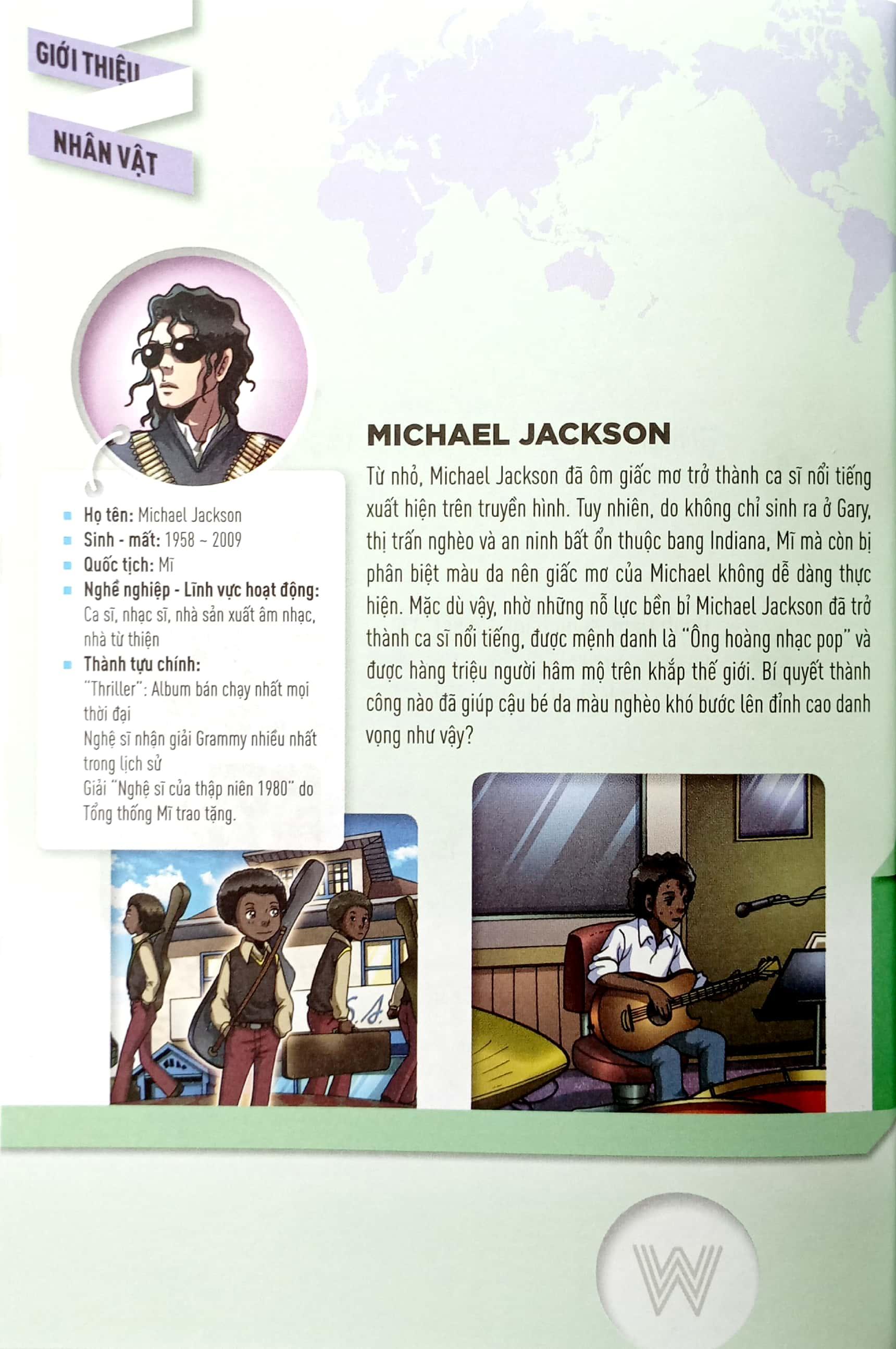 WHO? Chuyện Kể Về Danh Nhân Thế Giới: Michael Jackson (Tái Bản 2023) Michael Jackson – Từ một cậu bé có năng khiếu hát và nhảy thiên phú trở thành “Ông hoàng nhạc pop” được hàng triệu người yêu nhạc khắp thế giới mến mộ! Ngay từ khi còn nhỏ, cậu bé MichaelJackson đã bộc lộ tài năng hát và nhảy thiên phú khiến biết bao người yêu mến. Bằng ý chí và tình yêu âm nhạc, Michael Jackson đã vượt qua sự nghèo khó, nạn phân biệt chủng tộc… để trở thành huyền thoại bất tử trong làng âm nhạc thế giới. Bộ tranh truyện WHO? Chuyện kể về danh nhân thế giới - người bạn thân thiết của thiếu nhi. Những câu chuyện về cuộc đời và sự nghiệp vĩ đại của các danh nhân sẽ đem đến cho các em những ước mơ và hoài bão cao đẹp!