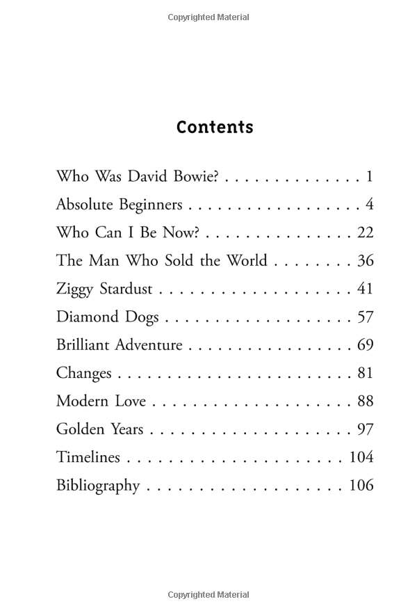 David Bowie, born David Robert Jones, wasn't just an incredible singer; he had an amazing talent for keeping his fans happily guessing about what he would do next. He alternated between musical genres with ease, established a successful acting career, and even created a legendary persona--the rocker alien Ziggy Stardust--that people still dress up as for Halloween each year. Author Margaret Gurevich takes readers through David Bowie's life and shows exactly why he is an inspiration to many people and is celebrated all over the world.