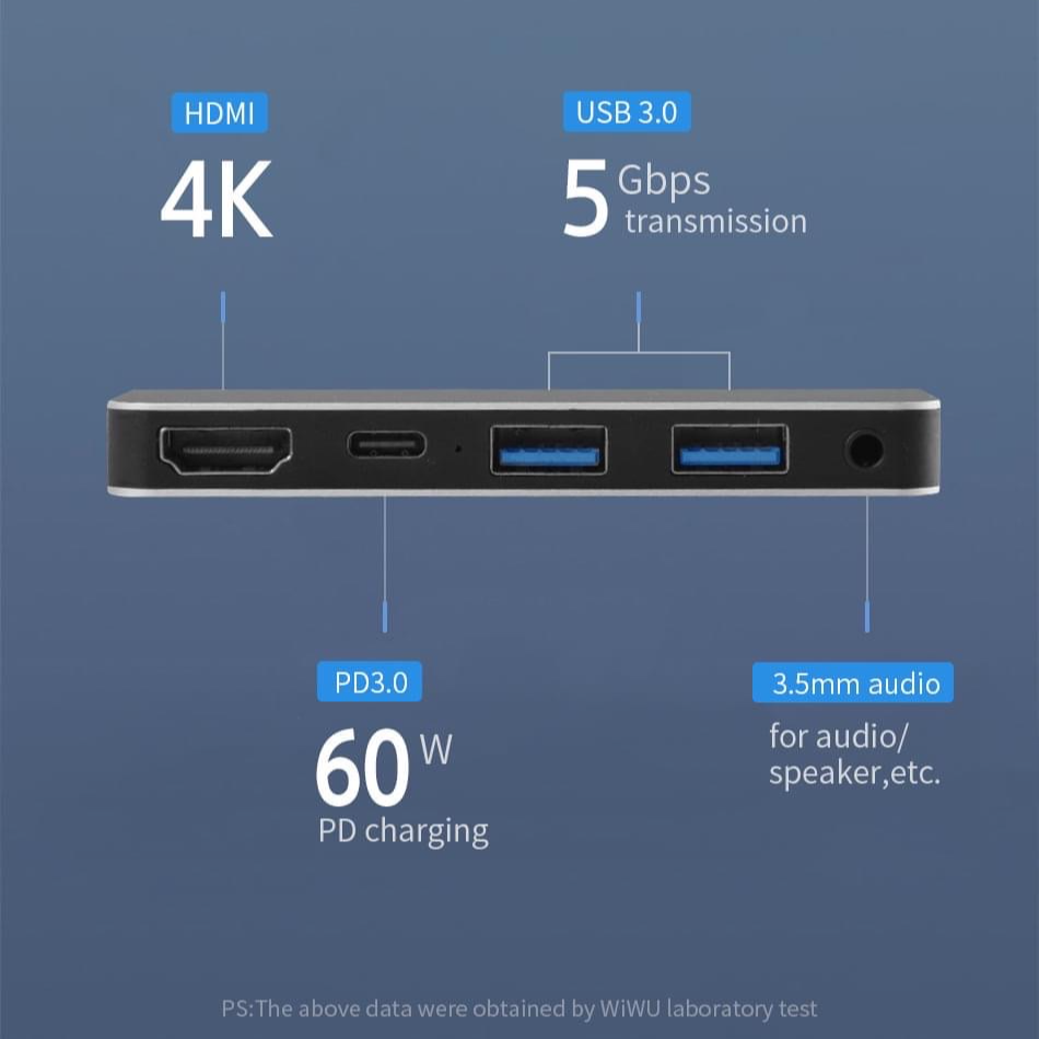 Hub WiWu Alpha 4 in 1 USB-C T5 Pro 1. Thương hiệu : WiWu 2. Mô tả sản phẩm - Thiết kế 4 trong 1: USB3.0 + HDMI + PD + giắc cắm 3,5 mm