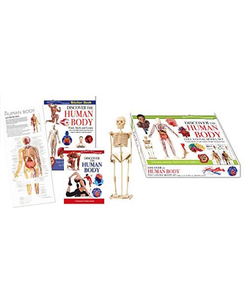Wonders of Learning discover the human body educational model set. This guide to human anatomy for children includes a reference book, sticker book, wall chart and model skeleton kit. Fun and informative for young biology fans.