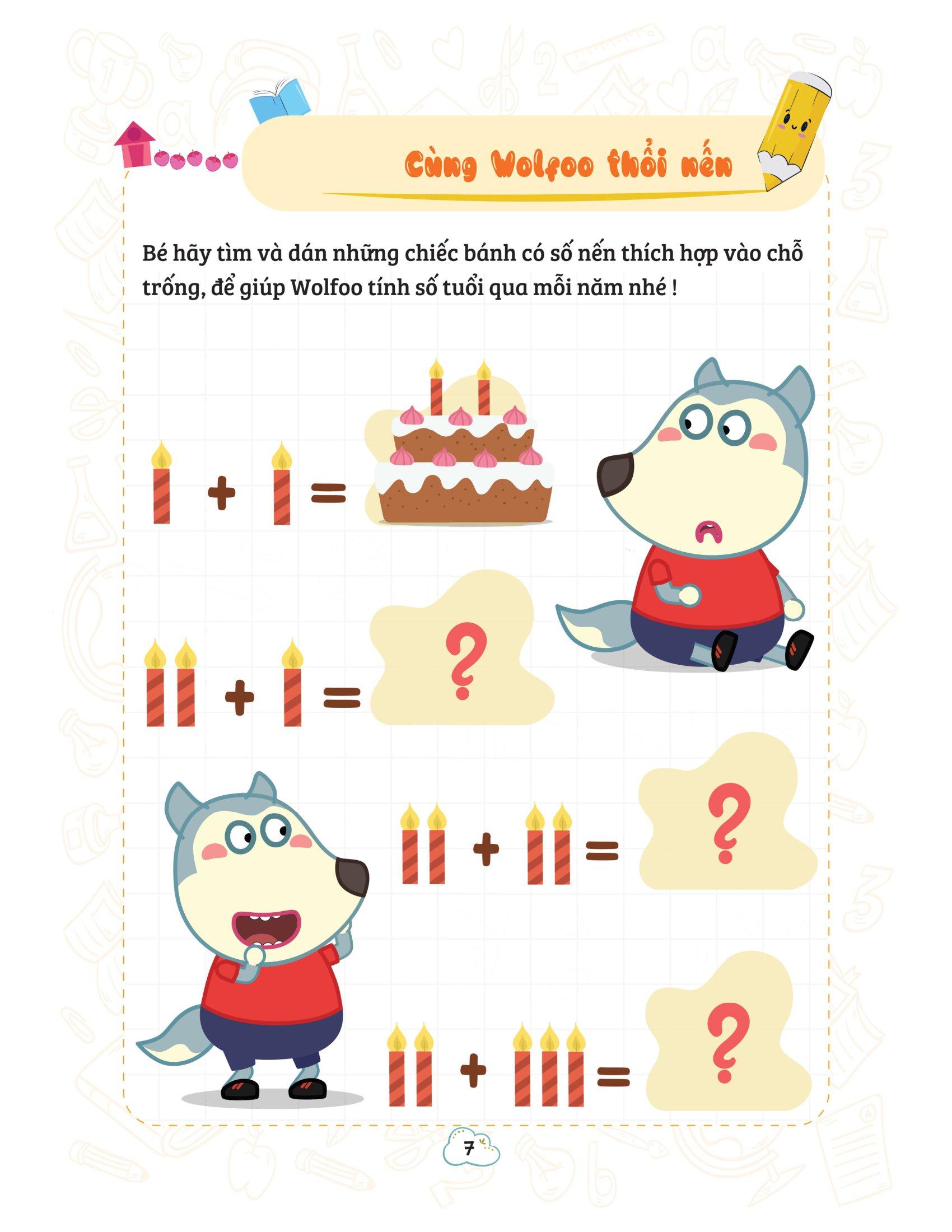 Cuốn sách thuộc trong bộ sách “Wolfoo khám phá toán học vui” gồm 4 cuốn dành trẻ từ 3 đến 6 tuổi. Được thiết kế theo hướng giúp trẻ trải nghiệm, làm quen với những kiến thức toán học cơ bản như: số đếm, phép tính, so sánh và phân biệt các đối tượng, nhận biết hình học cơ bản…