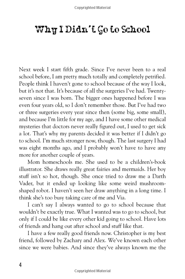 Auggie wants to be an ordinary ten-year-old. He does ordinary things - eating ice cream, playing on his Xbox. He feels ordinary - inside. But ordinary kids don't make other ordinary kids run away screaming in playgrounds. Ordinary kids aren't stared at wherever they go.