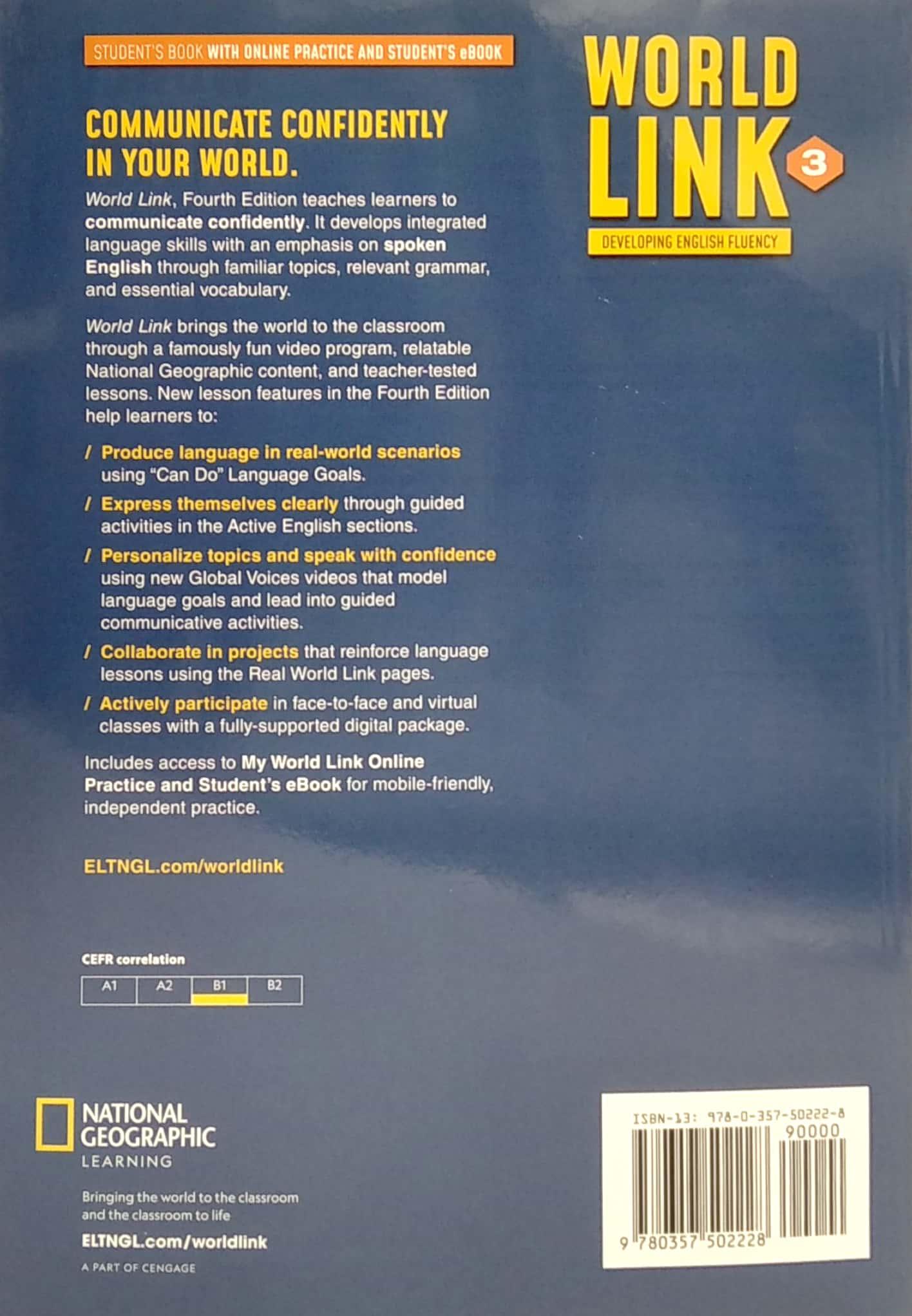 World Link, Fourth Edition teaches learners to communicate confidently. It develops integrated language skills with an emphasis on spoken English through familiar topics, relevant grammar, and essential vocabulary. World Link brings the world to the classroom through a famously fun video program, relatable National Geographic content, and teacher-tested lessons.