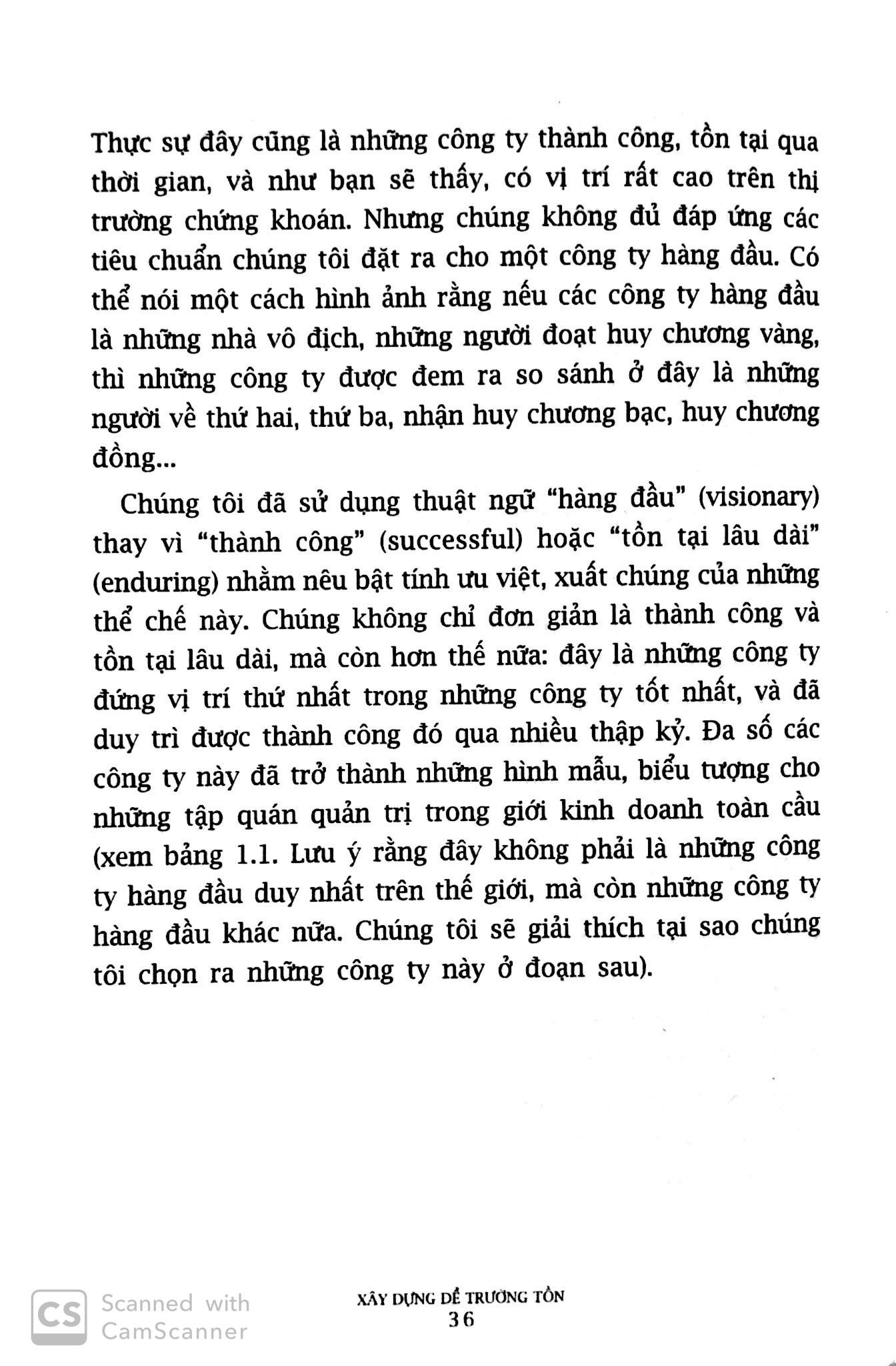 “Đây không phải là cuốn sách viết về các nhà lãnh đạo có tầm nhìn xa trông rộng, có sức thu hút lớn. Cũng không phải là cuốn sách viết về các sản phẩm, các khái niệm sản phẩm hay những thấu hiểu về thị trường mang tính chất có tầm nhìn xa. Cuốn sách này cũng không trình bày về các hoài bão của một doanh nghiệp. Mà đây chính là cuốn sách viết về cái gì đó quan trọng, trường tồn hơn nhiều - những công ty hàng đầu có tầm nhìn xa, hoài bão lớn”… (Trích giới thiệu của tác giả). Cuốn sách được trình bày với hàng trăm ví dụ cụ thể, sinh động, sắp xếp trong một khuôn mẫu rõ ràng, nhất quán của các khái niệm thực tế, tạo điều kiện dễ dàng áp dụng cho các nhà quản trị và nhà kinh doanh ở mọi cấp độ khác nhau. Xây dựng để trường tồn - như tên gọi của nó - thực sự là một bản kế hoạch chi tiết cho việc xây dựng các tổ chức phát triển và thành công trong thế kỷ XXI.