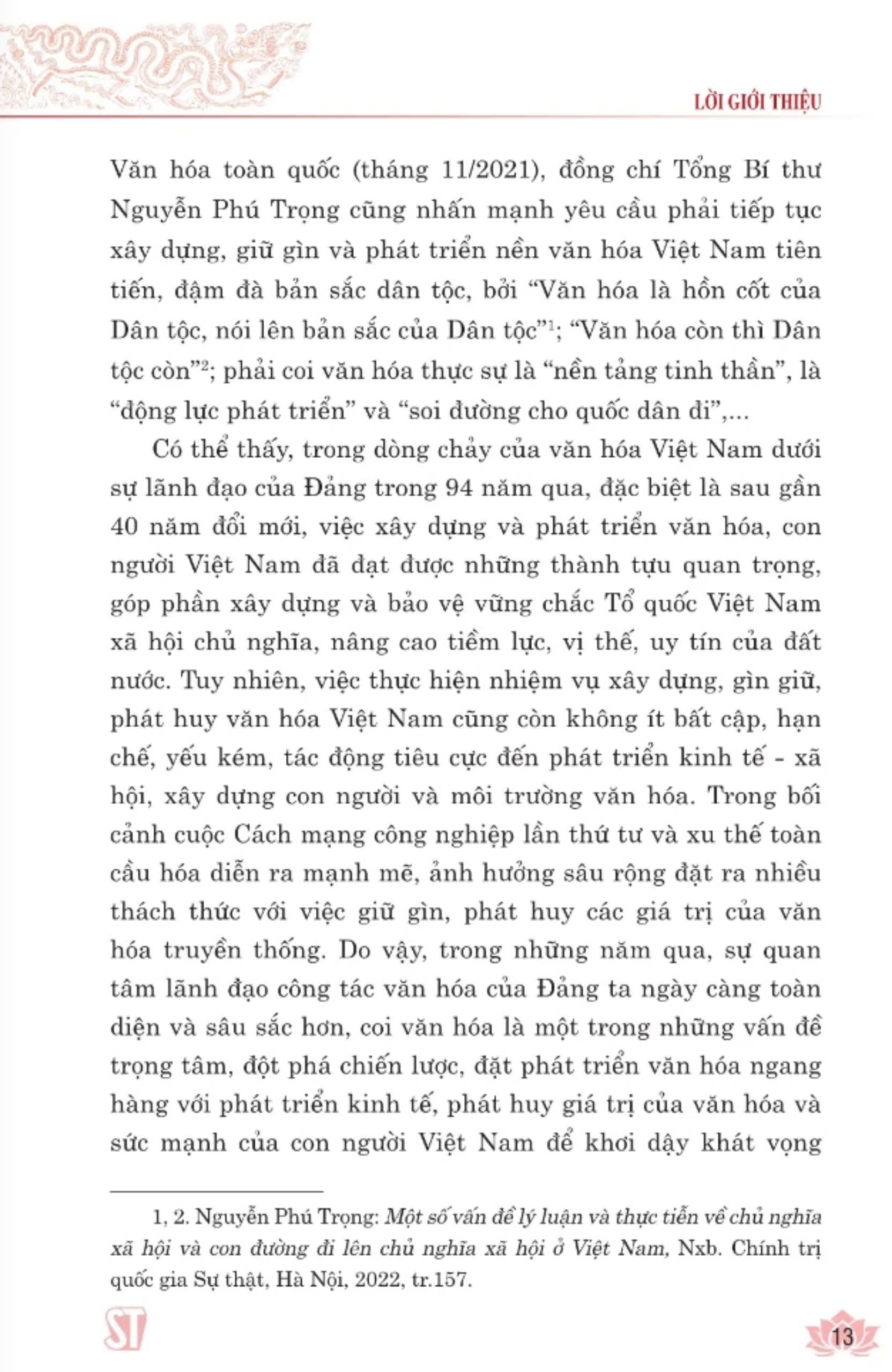 Nhằm hệ thống sự lãnh đạo, chỉ đạo của Đảng, đứng đầu là đồng chí Tổng Bí thư Nguyễn Phú Trọng, về xây dựng và phát triển nền văn hóa Việt Nam tiên tiến, đậm đà bản sắc dân tộc, giúp các ngành, các cấp, các địa phương, cán bộ, đảng viên, Nhân dân xác định rõ quan điểm, mục tiêu, định hướng, nhiệm vụ phát triển văn hóa, để văn hóa thực sự trở thành nền tảng tinh thần, động lực và nguồn lực nội sinh cho phát triển đất nước, Ban Tuyên giáo Trung ương chủ trì, phối hợp với Bộ Văn hóa, Thể thao và Du lịch, Nhà xuất bản Chính trị quốc gia Sự thật xuất bản cuốn sách Xây dựng và phát triển nền văn hóa Việt Nam tiên tiến, đậm đà bản sắc dân tộc của đồng chí Tổng Bí thư Nguyễn Phú Trọng.