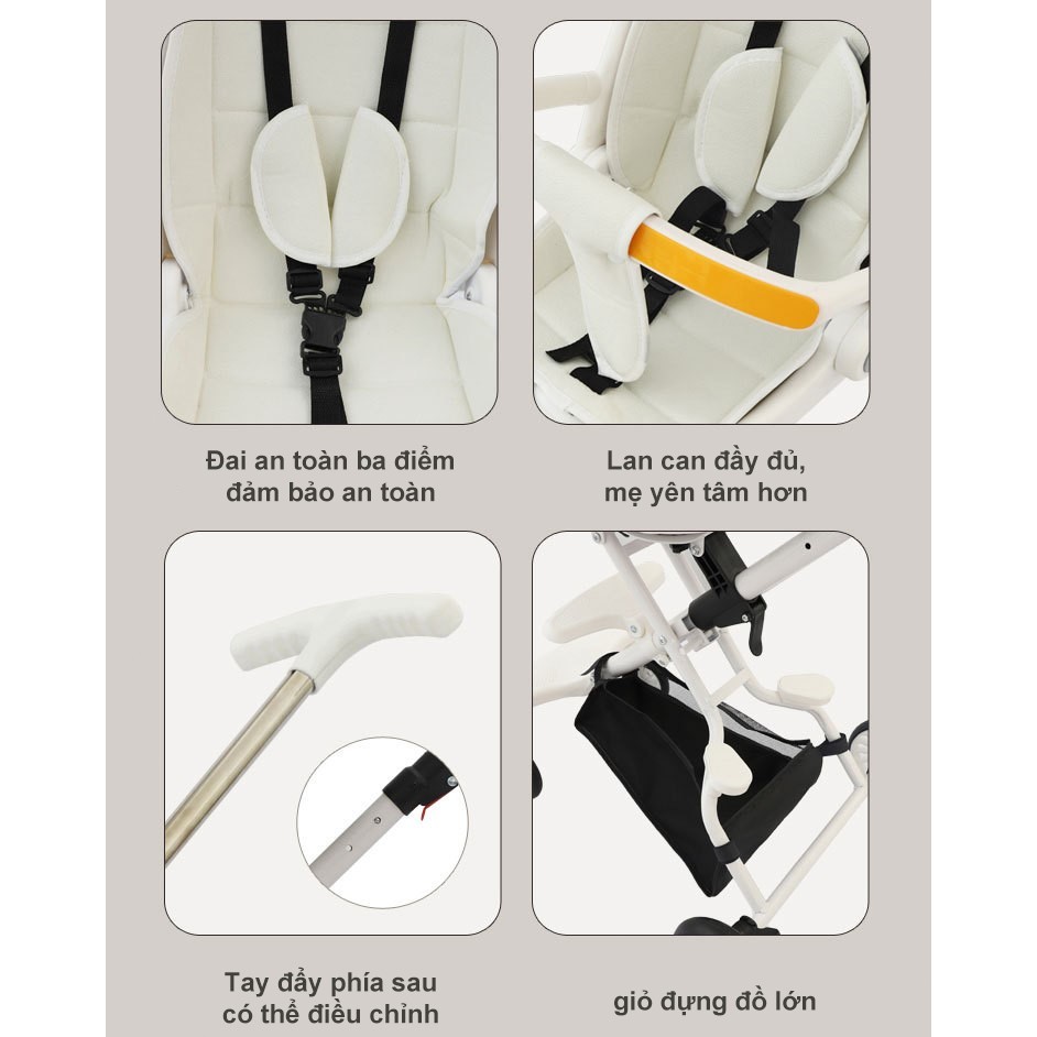 Chất liệu hợp kim siêu nhẹ Gấp gọn dễ dàng, tiện lợi sử dụng, mang đi du lị Sử dụng từ Sơ sinh đến 3 tuổi Điều chỉnh lưng ghế dễ dàng với nhiều góc