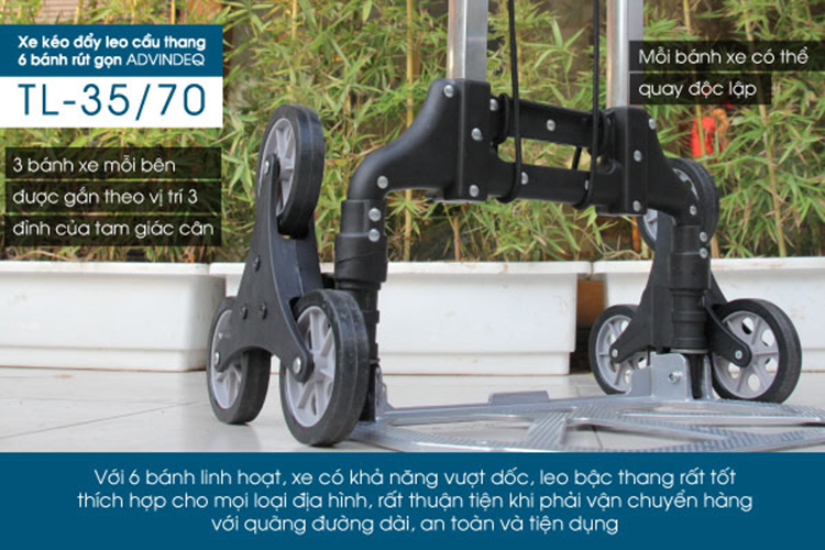 Mua tại TiktokTổng quan sản phẩm: Xe Kéo Đẩy Leo Cầu Thang 6 bánh rút gọn ADVINDEQ TL-35/70 trọng tải leo cầu thang 35 kg, đường bằng 70kg được làm bằng hợp kim nhôm có độ bền cao, trọng lượng xe 3.5kg cực nhẹ so với các sản phẩm xe đẩy hàng sắt thông thường trên thị trường. Xe kéo đẩy leo cầu thang 6 bánh rút gọn ADVINDEQ TL-35/70 Khung xe bằng khung nhôm định hình, giá đỡ hàng bằng gang đúc, giúp người lao động kéo hoặc đẩy hàng hóa dễ dàng hơn, an toàn hơn và năng suất hơn. Xe kéo hoặc đẩy hàng với khả năng di chuyển hàng hoá lên xuống cầu thang nhẹ nhàng tiện lợi, tải trọng khá lớn, đảm bảo đúng như công bố. Khung xe được làm bằng nhôm cao cấp, siêu bền Giá đỡ được đúc bằng gang, chịu được tải trọng Xe có tải trọng leo cầu thang 35kg, đi đường bằng 70kg, gồm có 6 bánh xe. Các ống được làm từ hợp kim nhôm rất chắc chắn, độ bền vượt bậc. Loại xe này có khả năng vượt dốc, leo cầu thang, thích nghi với mọi địa hình leo trèo. Công dụng: Xe được thiết kế thích nghi cho công việc hậu cần, dùng để vận chuyển tài liệu, hàng hóa trong các cơ quan, văn phòng, siêu thị, hộ gia đình, các nhà máy, xưởng sản xuất vừa và nhỏ,… Đặc biệt với thiết kế bánh xe to – mỗi bên 3 bánh (tổng 6 bánh xe) dùng vận chuyển trong các địa hình không bằng phẳng, đặc biệt là vận chuyển hàng hóa lên xuống cầu thang trong các tòa nhà cao tầng rất tiện lợi. Cấu tạo các bánh xe: Gồm 6 bánh thiết kế trên cùng 1 trục theo kiểu hình tam giác, mỗi bánh hoạt động theo phương thức độc lập. Một bánh làm trụ, bánh kia bám vào trên/dưới cầu thang, cứ thế các bánh xe hoạt động luân phiên nhau cho đến khi lên/xuống các bậc cầu thang còn lại. Một bánh làm giữ làm trụ Bánh kia bám vào bề mặt bậc cầu thang làm điểm tựa cho xe Các bánh xe hoạt động tuần hoàn cho đến khi nào đi hết các bậc cầu thang Dưới mỗi bánh xe thiết kế nhựa cao cấp có độ ma sát cao, bám rất chắc vào sàn nhà, sàn bậc cầu thang không bị trượt. Xe leo lên và đi xuống cầu thang một cách dễ dàng. Bánh xe có độ ma sát cao, khả năng bám vào mặt sàn cực chắc
