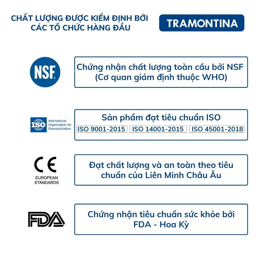 Các sản phẩm của Tramontina cũng đạt tiêu chuẩn và được chứng nhận toàn cầu bởi NSF (Cơ quan giám định thuộc WHO), đạt chất lượng và an toàn theo tiêu chuẩn của Liên Minh Châu Âu (CE) và chứng nhận tiêu chuẩn sức khỏe bởi FDA – Hoa Kỳ.