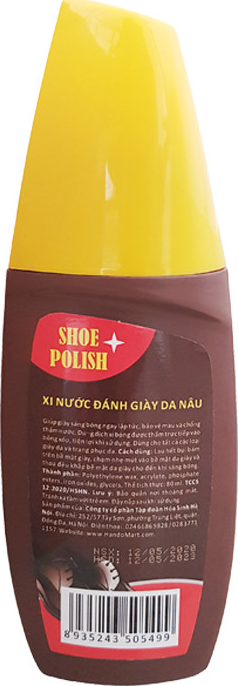 Tên SP: Xi nước đánh giày da, đồ da Hando 80ml (màu Nâu) Giữ màu trong thời gian ngắn. Dễ sử dụng và hiệu quả nhanh hơn. Xi nước, dùng làm bóng giày và giữ
