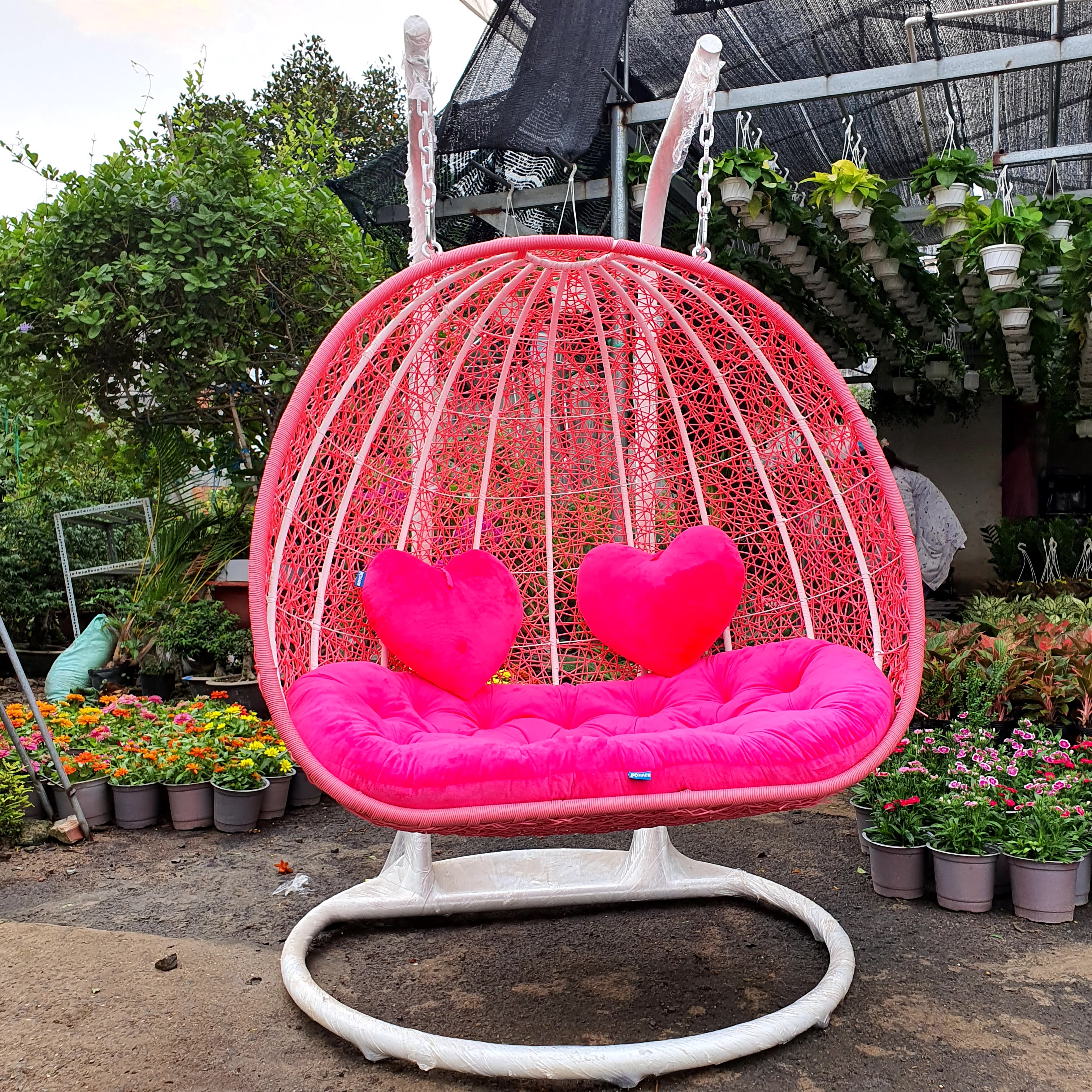 - Thân lồng xích đu được sơn tĩnh điện và được đan nhựa giả mây màu hồng như hình