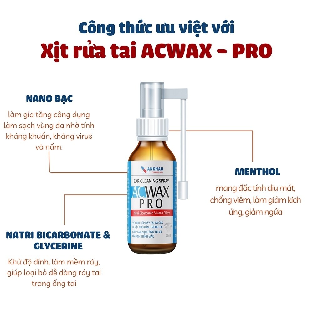 XỊT RỬA TAI ACWAX PRO CHO TRẺ EM VÀ NGƯỜI LỚN   Xịt rửa tai Acwax Pro là sản phẩm an toàn và hiệu quả cho việc làm sạch tai của trẻ em từ 3 tuổi trở lên và người lớn. Sản phẩm giúp vệ sinh lớp ráy tai và loại bỏ các dị vật nhỏ có thể bám trong tai, từ đó giúp duy trì sạch sẽ và ổn định thính giác.   Thành phần chính của xịt rửa tai Acwax Pro An Châu bao gồm Natri bicarbonate và Glycerine, giúp làm mềm ráy tai để dễ dàng loại bỏ. Sự kết hợp với Nano bạc và Methol cung cấp công dụng làm sạch mạnh mẽ, đồng thời giúp giảm ngứa tai hiệu quả.   Với chỉ một thao tác xịt đơn giản, sau đó đợi trong vòng 1 phút và lau sạch bằng bông mềm, bạn đã có thể loại bỏ lớp ráy tai và các dị vật nhỏ trong tai mà không gây tổn thương cho màng nhĩ. Đây thực sự là một giải pháp tiện lợi và an toàn cho việc vệ sinh tai hàng ngày.   CÔNG DỤNG