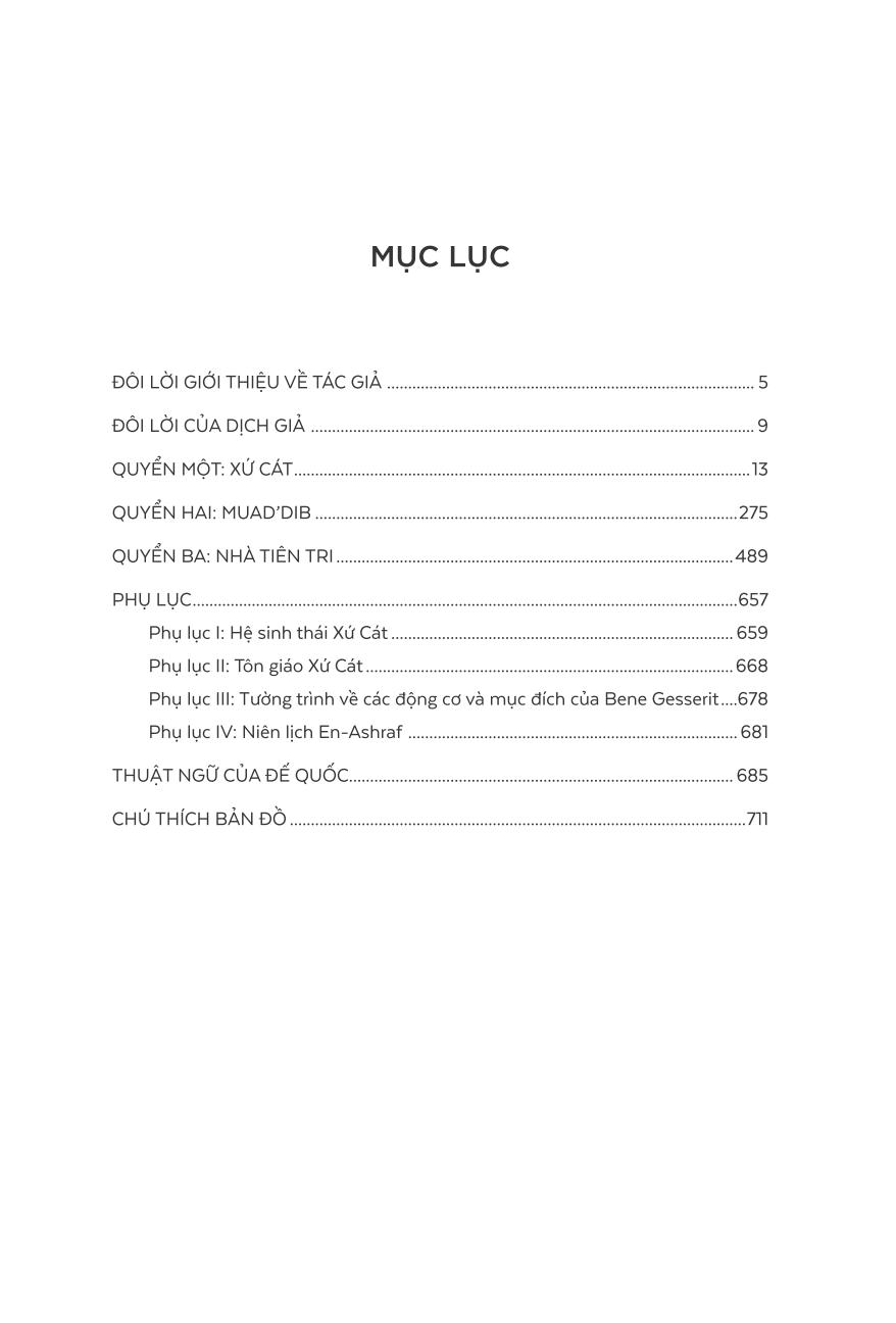 Là Lisal al-Gaib của người Fremen, là Kwisatz Haderach của học viện Bene Gesserit, chàng công tước trẻ tuổi Paul Atreides đã làm tất cả những gì có thể để thay đổi định mệnh đó. Cha bị giết chết, mẹ bị cho là kẻ phản bội, gia tộc bị tàn sát, bản thân bị săn đuổi đến đường cùng, Paul đơn độc dấn thân vào một cuộc phiêu lưu sinh tử, không hề biết rằng mỗi hành động của mình sẽ góp phần quyết định vận mệnh của cả thiên hà. Sa mạc Arrakis khắc nghiệt tưởng như sẽ là nơi chôn vùi vĩnh viễn vinh quang của gia tộc Atreides, nhưng hóa ra lại thành điểm khởi đầu cho một huyền thoại mới…