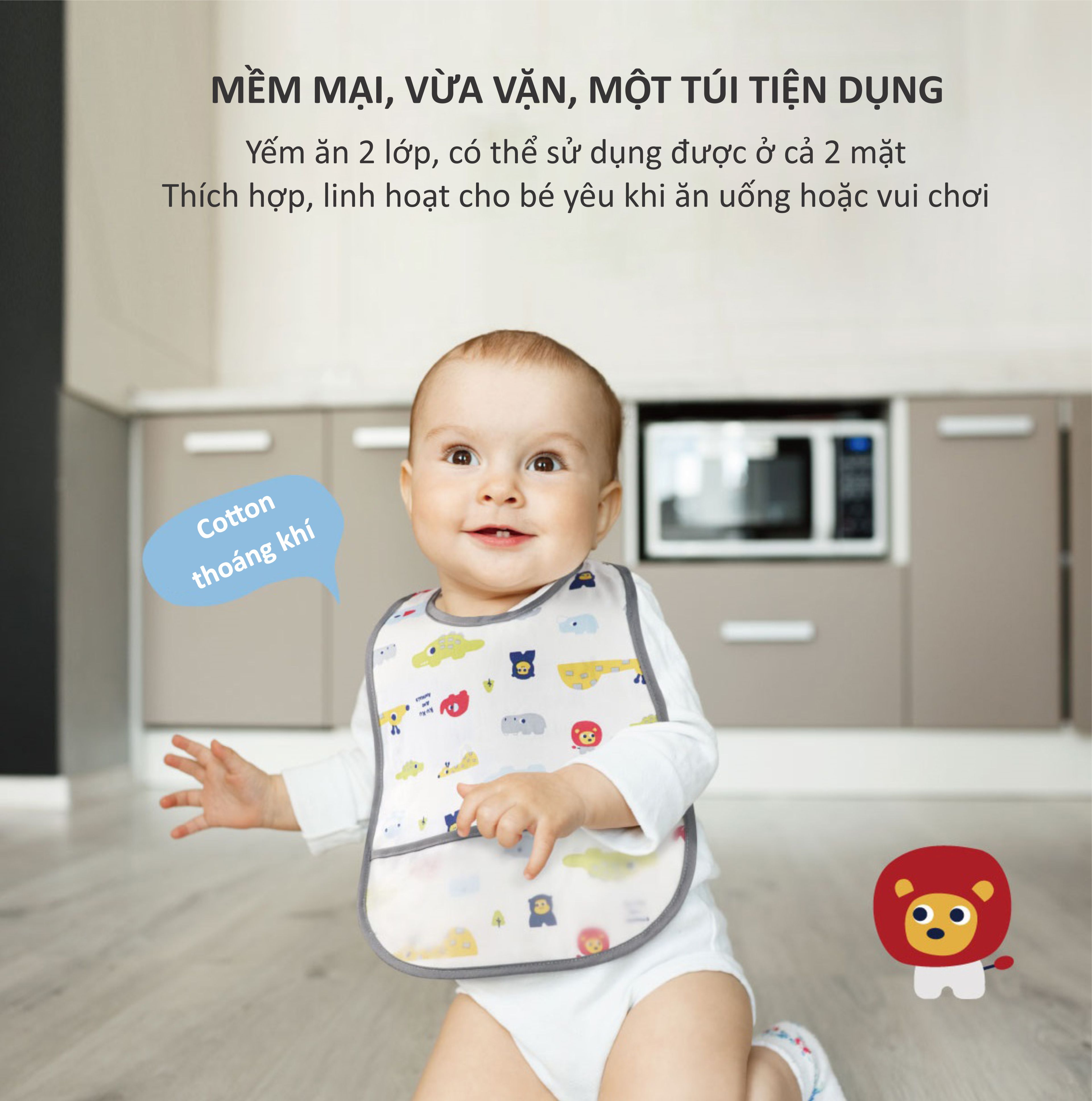 Yếm có nút giúp mẹ có thể giữ cho quần áo của bé luôn sạch sẽ mỗi khi ăn, bữa ăn của bé sẽ bớt bộn bề mà cũng dễ dàng khi vệ sinh. Đặc