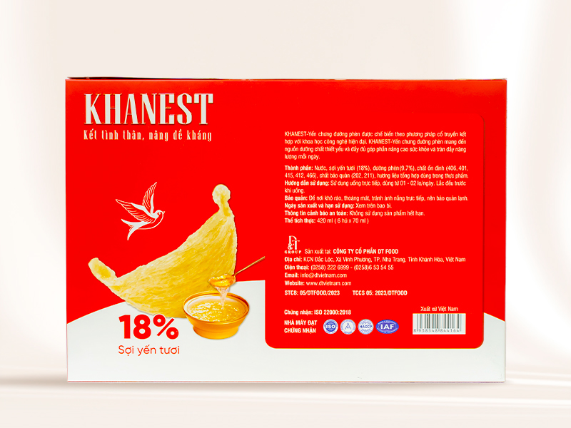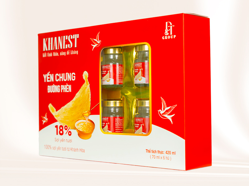 - Yến sào: Hỗ trợ tăng sức đề kháng cho cơ thể, chống lão hóa, ổn định thần kinh, trí nhớ, kích thích tiêu hóa, phục hồi sức khỏe nhanh chóng trong thời gian dưỡng bệnh. Đối tượng sử dụng: thích hợp cho mọi đối tượng đăc biệt trẻ từ 3 tuổi trở lên Sản xuất: Việt Nam Thành phần: Nước, , Yến sào (25%), đường phèn (4%) , chất ổn định (E406), hương liệu dùng cho thực phẩm. Cách dùng: - Lắc nhẹ trước khi uống, ngon hơn khi uống lạnh, tránh đun nóng sản phẩm trước khi sử dụng. - Uống trực tiếp từ lọ. --Uống từ 1 - 2 lọ/ngày. Sản phẩm thích hợp cho người lớn tăng sức đề kháng giúp cơ thể khỏe mạnh, phục hồi sức khỏe cho người bệnh, Không sử dụng sản phẩm khi hết hạn, nên sử dụng một lần sau khi mở nắp.