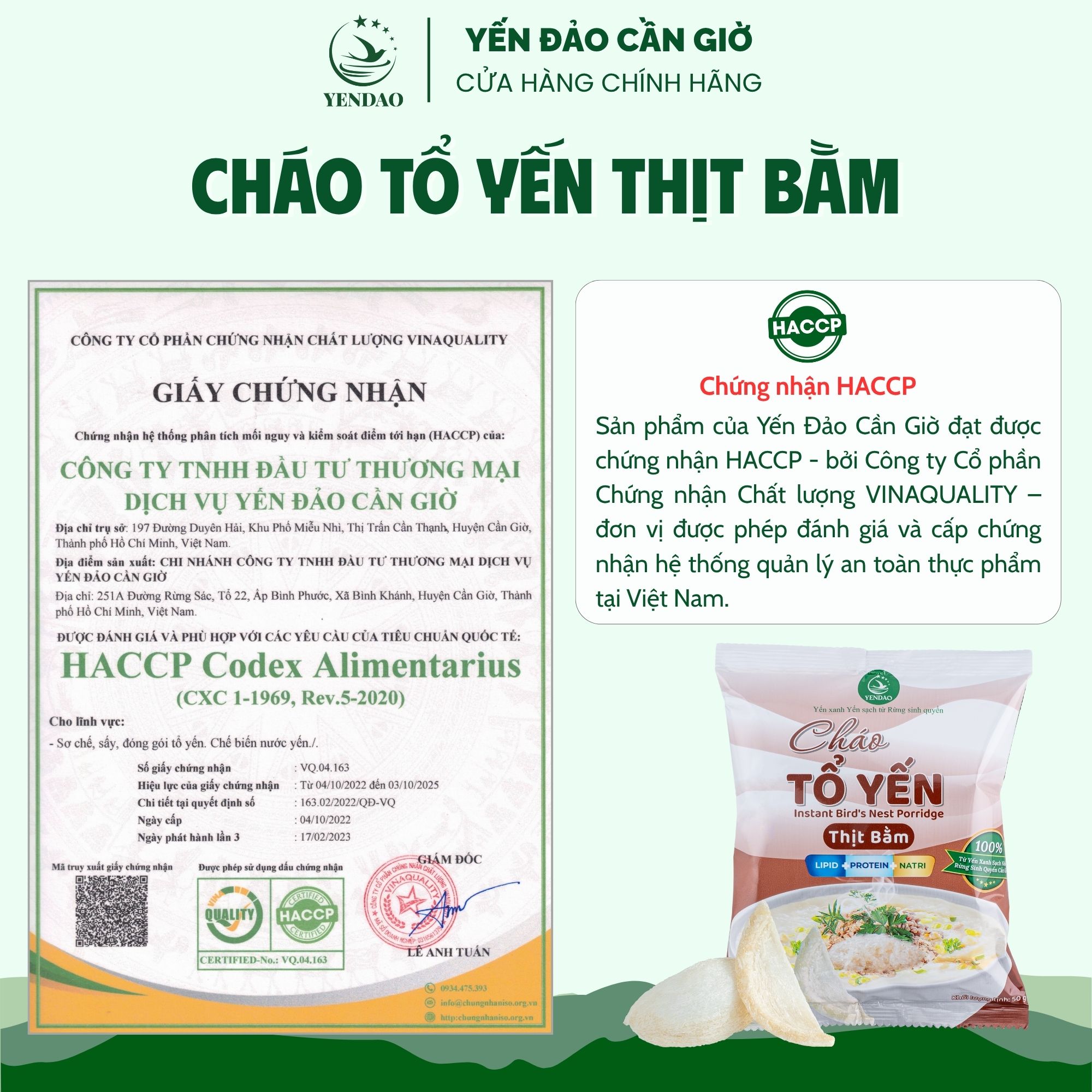 - Mô tả: Cháo Tổ Yến là sản phẩm ăn liền tiện lợi, kết hợp tổ yến tinh chế từ vùng sinh quyển Cần Giờ cùng rau củ sấy thăng hoa. Món cháo thơm ngon, dễ dùng, phù hợp cho bữa ăn nhanh mà vẫn đảm bảo dinh dưỡng. Phù hợp cho cả trẻ nhỏ, người lớn tuổi, phụ nữ sau sinh và người cần bồi bổ. Sản phẩm thích hợp dùng làm bữa phụ hoặc bữa sáng nhẹ, giúp bổ sung năng lượng và dưỡng chất cho cơ thể. Cháo yến mềm mịn, dễ tiêu hóa, tiện lợi cho người lớn tuổi, người cần phục hồi sức khỏe, phụ nữ sau sinh, trẻ em và cả người bận rộn. THÔNG TIN SẢN PHẨM