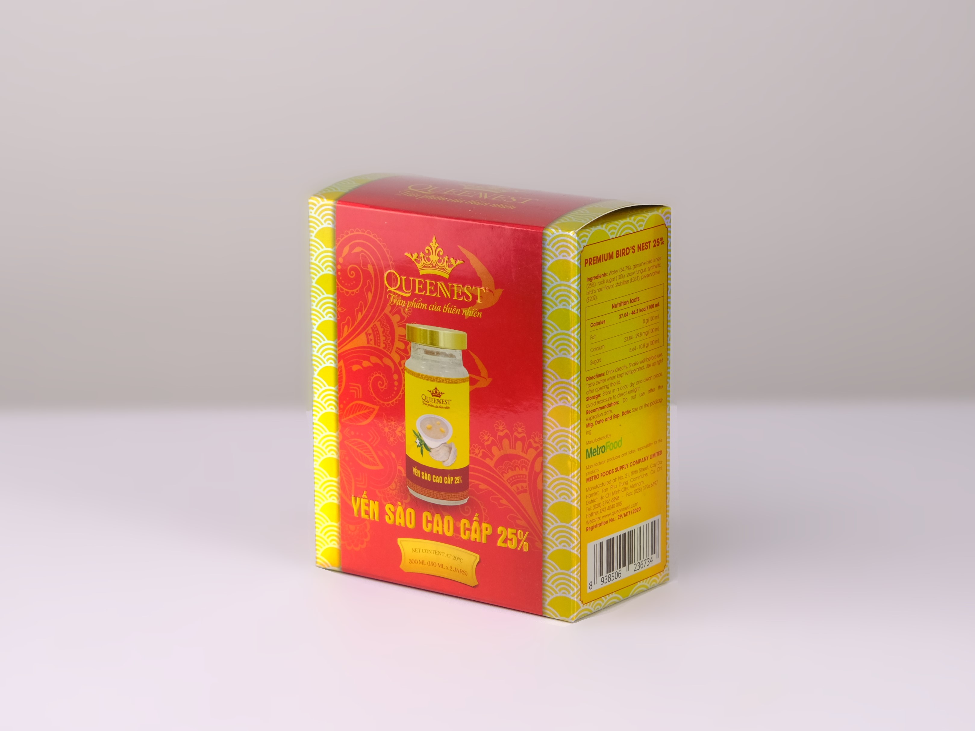- Tên sản phẩm: YẾN SÀO CAO CẤP 25% - Thành phần: Nước (64.7%), tổ yến thiên nhiên (25%), đường phèn (10%), ngân nhĩ, hương yến tổng hợp, chất ổn định (E331), chất bảo quản