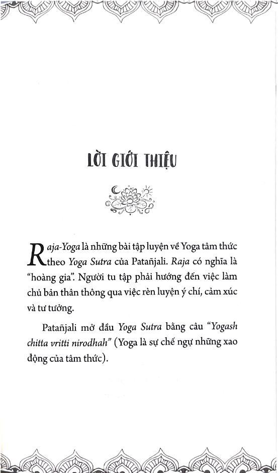 Raja - Yoga là những bài tập luyện về Yoga tâm thức theo Yoga Sutra của Patãnjali. Người tu tập phải rèn luyện ý chí, cảm xúc và tư tưởng. Thông qua sự hồi hướng các giác quan, người tu tập sẽ phát triển một khả năng làm chủ tâm thức. Sự chấp nhận hay không chấp nhận việc kiểm soát các giác quan là một đường ranh quan trọng của người tu tập yoga để từ đó đạt tới các cấp bậc cao nhất là thiền (dhyana) và định (samadhi), tâm thức sẽ tiến tới sự hợp nhất với cõi vô cùng.